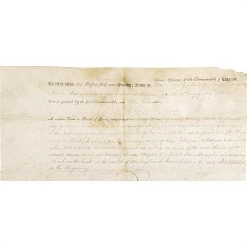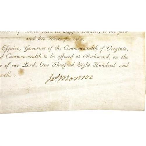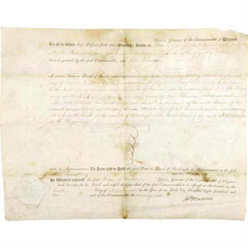 <B>Partially Printed Document Signed by James Monroe </B></I> (1758-1831) as Governor of Virginia, 15.5" x 12", vellum, Richmond, May 19, 1783. Rare, early Monroe signature <I>"Jas. Monroe"</B></I> on this certificate deeding "<I>a certain Tract or Parcel of Land</B></I>" to John Johnston. The official seal of the Commonwealth of Virginia is affixed at bottom left. The document is in fair-good condition with folds, creases, soiling, some staining at the top and along the folds, and some chipping at the corners.<BR><BR><b>Shipping:</b> Flat Material, Small (<a target="_blank" href="http://www.heritageauctions.com/common/shipping.php">view shipping information</a>)