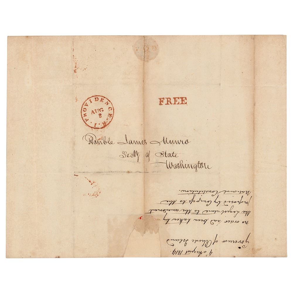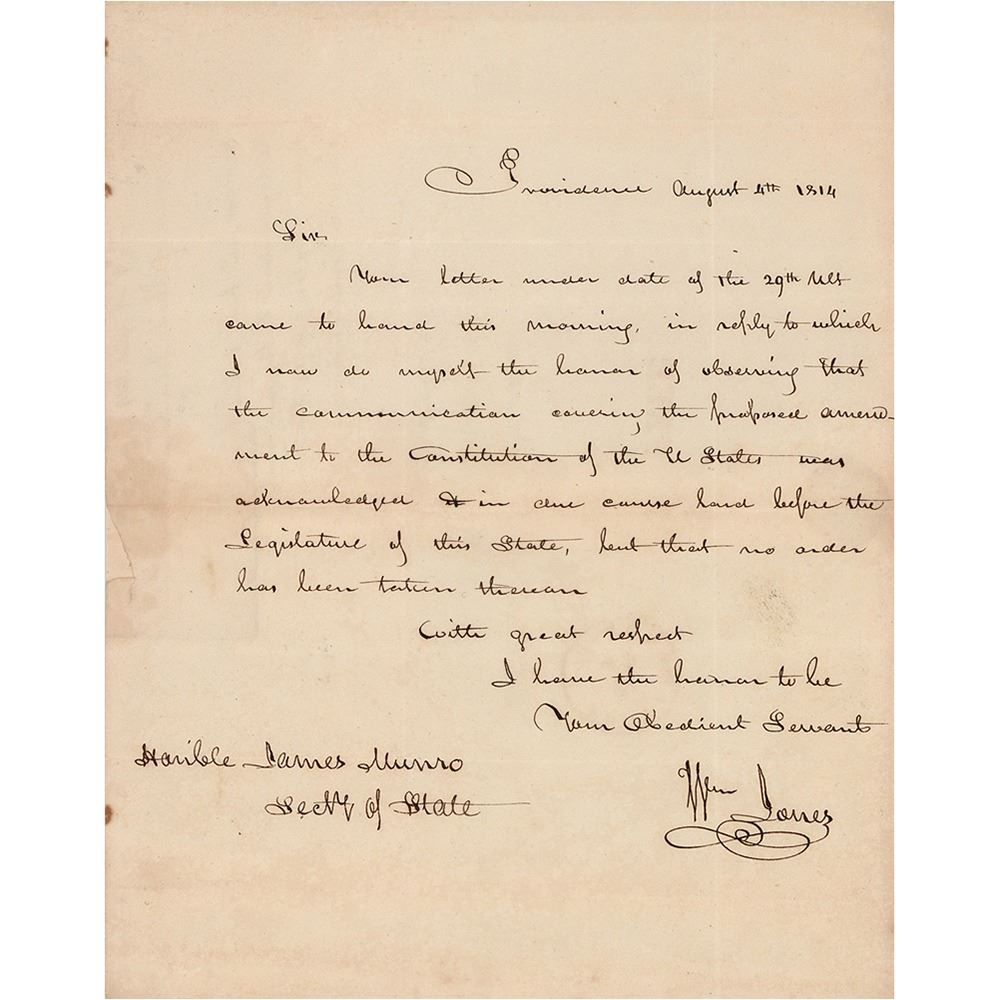 ALS signed “Wm. Jones,” one page, 7.75 x 9.75, August 4, 1814. Handwritten letter to "Hon'ble. James Munro, Sect'y of State," in part: "I now do myself the honor of observing that the communication concerning the proposed amendment to the Constitution of the U. States was acknowledged & in due course laid before the Legislature of this State, but that no order has been taken thereon." Addressed on the reverse in Jones's hand to "Hon'ble James Munro, Sect'y of State, Washington." In fine condition. A Federalist and veteran of the Revolutionary War, William Jones (1753–1822) served as the eighth Governor of Rhode Island from 1811 to 1817.