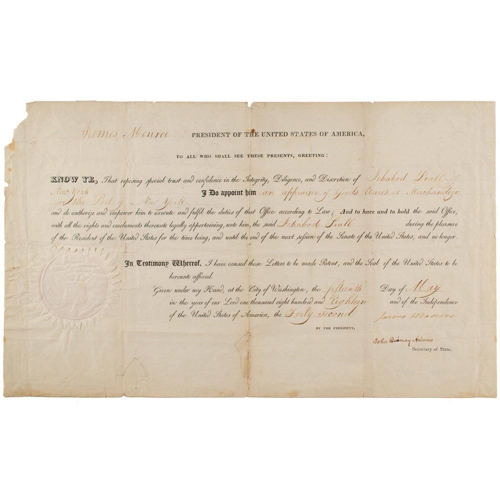 Partly-printed DS, signed “James Monroe" as president and "John Quincy Adams" as secretary of state, one page, 16 x 9.75, May 15, 1818. President Monroe appoints Ichabod Pratt of New York as "an appraiser of Goods Wares or Merchandize for the Port of New York." Neatly signed at the conclusion by President Monroe and countersigned by Secretary of State Adams. The white paper seal affixed to the lower left remains fully intact. In very good condition, with areas of paper loss, and repairs on the back to various tears and fold splits; the signatures are clean and unaffected. A great combination of signatures, making an appointment for an unusual position.