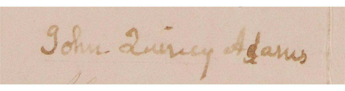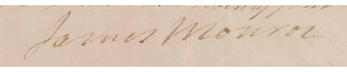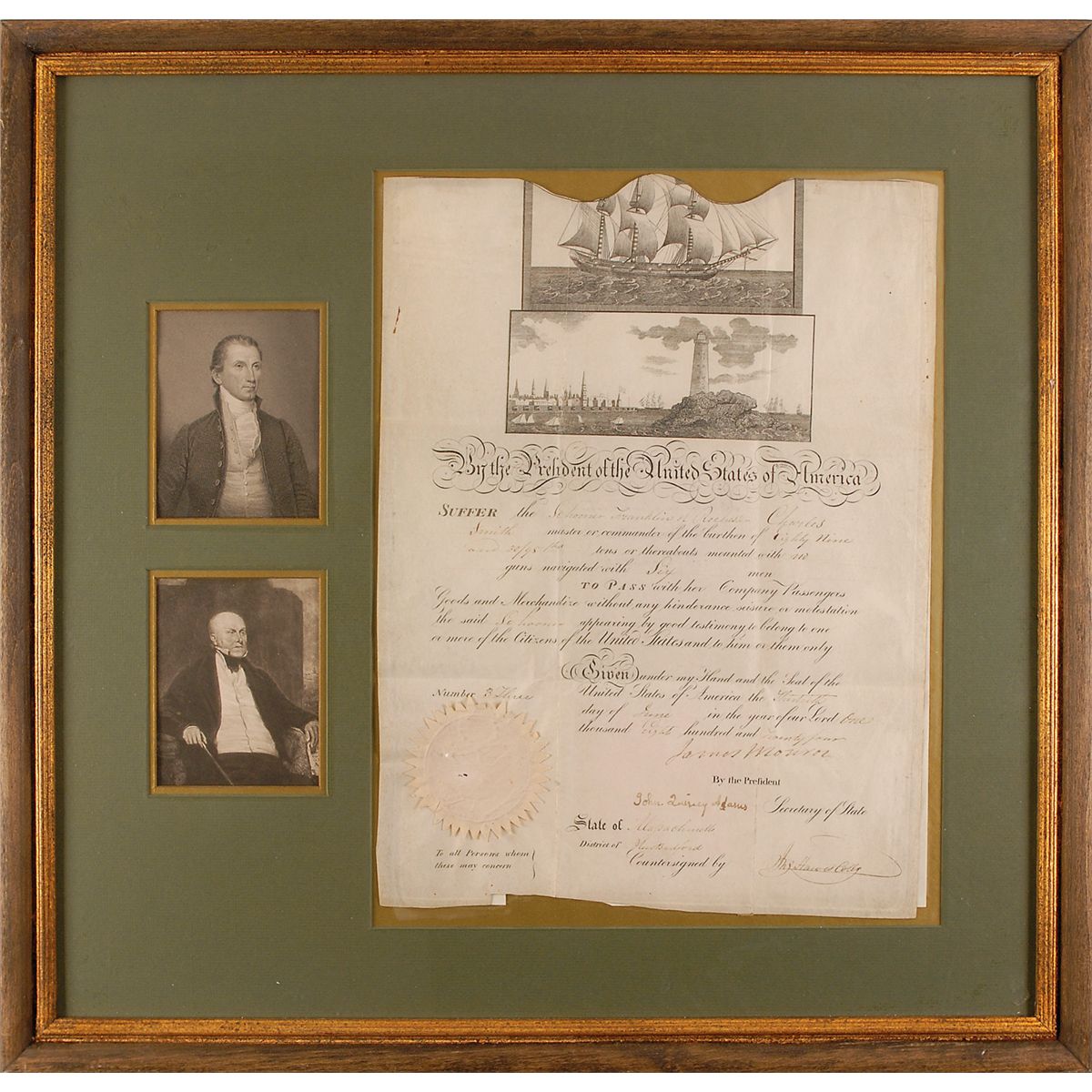 Partly-printed vellum DS, signed “James Monroe” as president and “John Quincy Adams” as Secretary of State, one page, 11 x 15, June 13, 1824. Scalloped-top ship’s pass issued to the “Schooner Franklin of Rochester Charles Smith master or commander…mounted with no guns navigated with six men To Pass with her Company Passengers Goods and Merchandize without any hinderance seisure or molestation the said Brig appearing by good testimony to belong to one or more of the Citizens of the United States and to him or them only.” Matted and framed with engraved portraits of Monroe and Adams, to an overall size of 22.5 x 21.5. In very good condition, with intersecting folds, one through a single letter of Monroe’s signature, and scattered light toning, soiling, and wrinkling. The white seal is toned, but intact. An impressive early presidential pairing. Oversized.