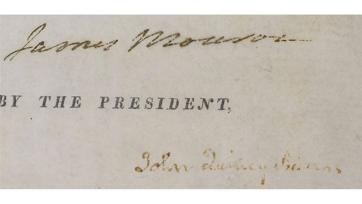 Partly-printed DS one page, 11 x 15, November 18, 1818. A patent issued to Abraham Taylor who “has invented a new and useful improvement being a mode of propelling Boats &c, called the Columbian Principle which improvement he states has not been known or used before his application; hath made oath and that the same hath not to the best of his knowledge or belief been previously used or known in this or any foreign country, that he does verily believe that he is the true inventor or discoverer of the said improvement.” The attached three double-sided pages contain a detailed description of the invention written and signed by Taylor. Adams’s signature fairly light, but mostly legible, central horizontal and vertical folds, other handwritten portions of document and Taylor’s description light, but legible, some scattered light soiling, otherwise very good condition. The crisp white seal is tattered at the edges and toned and the document is still bound with its original green ribbon.