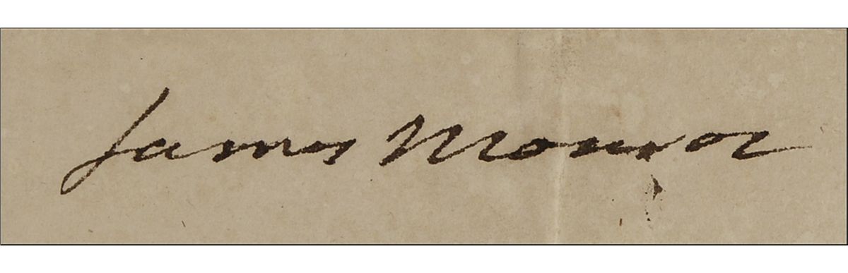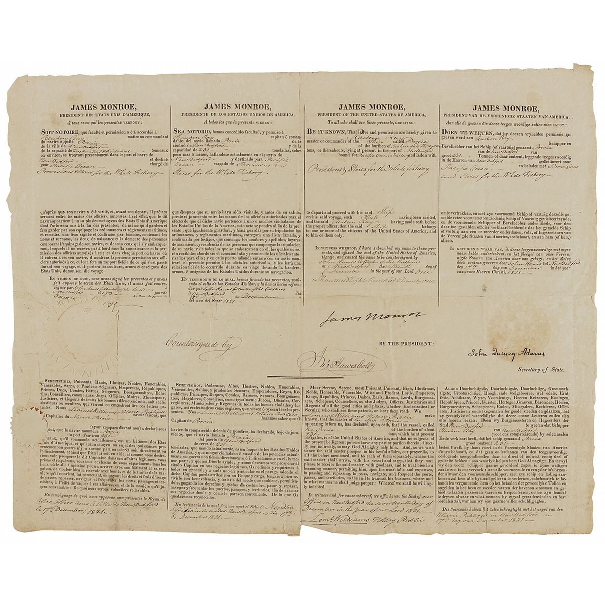 Partly-printed DS as president, one page, 20.25 x 16.5, December 15, 1821. Four-language ship’s papers issued to “Reuben Ray master or commander of the Ship called Porcia…lying at present in the port of New Bedford bound for Pacific Ocean, and laden with Provisions & Stores, for the Whale fishery.” Signed in the third panel by Monroe, and countersigned by John Quincy Adams. In good to very good condition, with intersecting folds, one each through a single letter of each signature, old reinforcement along reverse of central vertical fold, scattered edge chipping and wear, uniform toning with a few heavier spots, and scattered soiling. The seal is toned, but intact. Both signatures are quite bold and mostly unaffected by the flaws. The Portia sailed the Pacific for three years returning with 1800 barrels of sperm whale oil; it was Ray’s only recorded voyage.