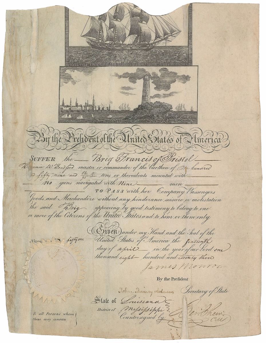Partly-printed vellum DS, signed “James Monroe” as president and “John Quincy Adams” as secretary of state, one page, 11.5 x 15, April 16, 1823. Scallop-topped ship’s pass issued for “the Brig Francis of Bristol, Benjamin W. Bradford master or commander…To Pass with her Company, Passengers, Goods and Merchandize without any hinderance seisure or molestation.” Nicely signed at the conclusion by Monroe and countersigned by Adams. The white paper seal affixed to the lower left remains fully intact. In very good condition, with heavy wrinkling, and areas of repaired vellum loss near upper and lower edges.