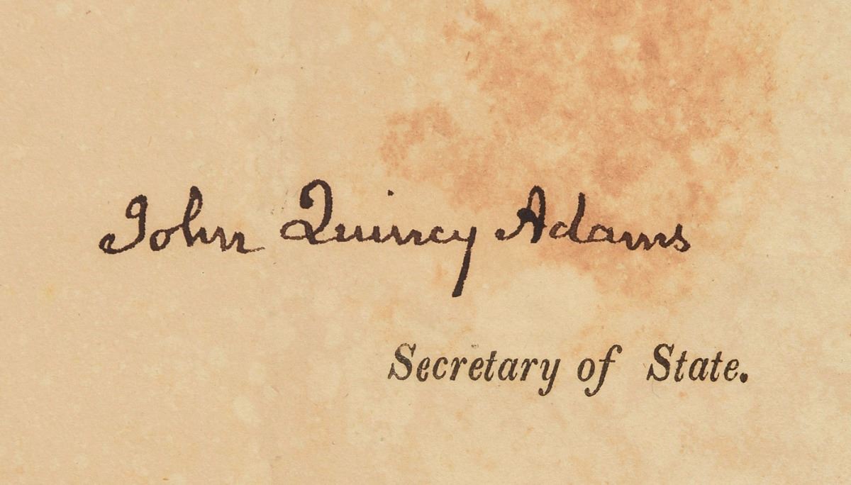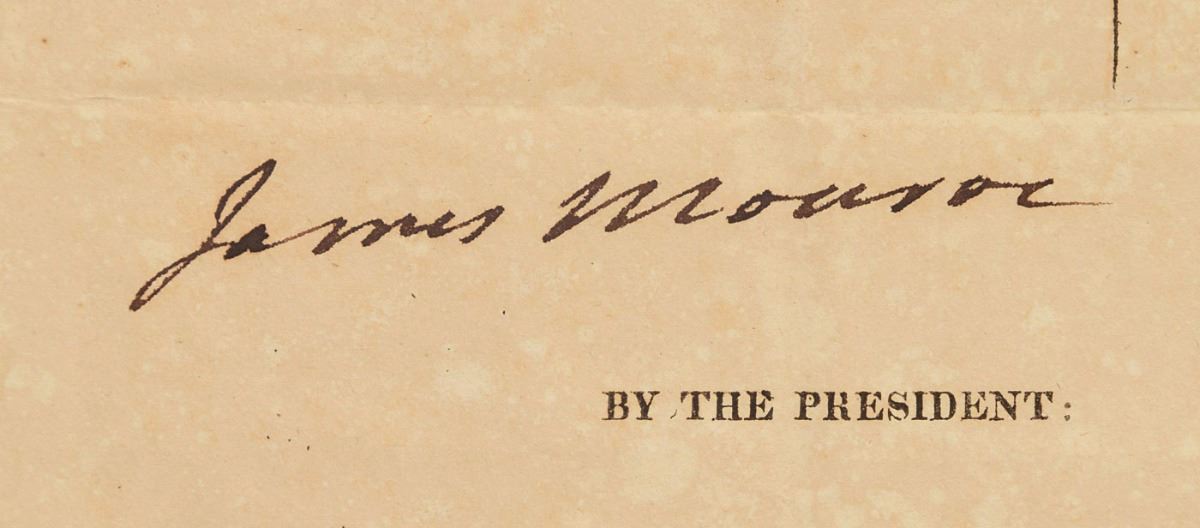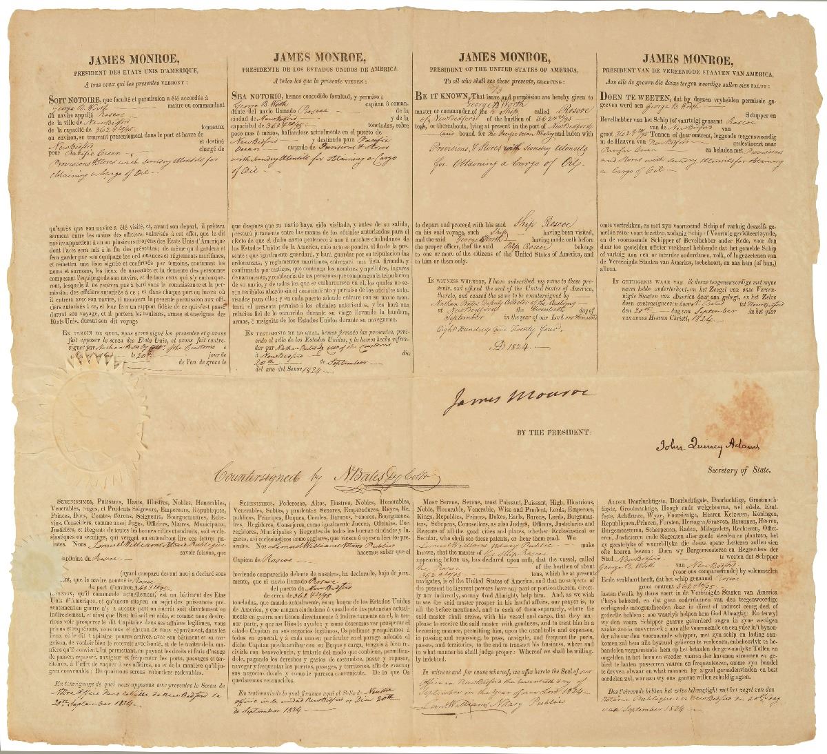 Scarce partly-printed DS, signed “James Monroe" as president and "John Quincy Adams" as secretary of state, one page, 20.75 x 16.5, September 20, 1824. Four-language ship’s papers issued to “George B. Worth master or commander of the Ship called Roscoe…lying at present in the port of New Bedford bound for the Pacific Ocean Whaling, and laden with Provisions, & Stores with sundry utensils for obtaining a cargo of oil.” Signed in the third panel by Monroe, and countersigned by Adams as Secretary of State. White paper seals remain affixed to left side. In fine condition, with light mottled overall toning. Four language passes signed by both Monroe and Adams remain scarce and highly sought-after.