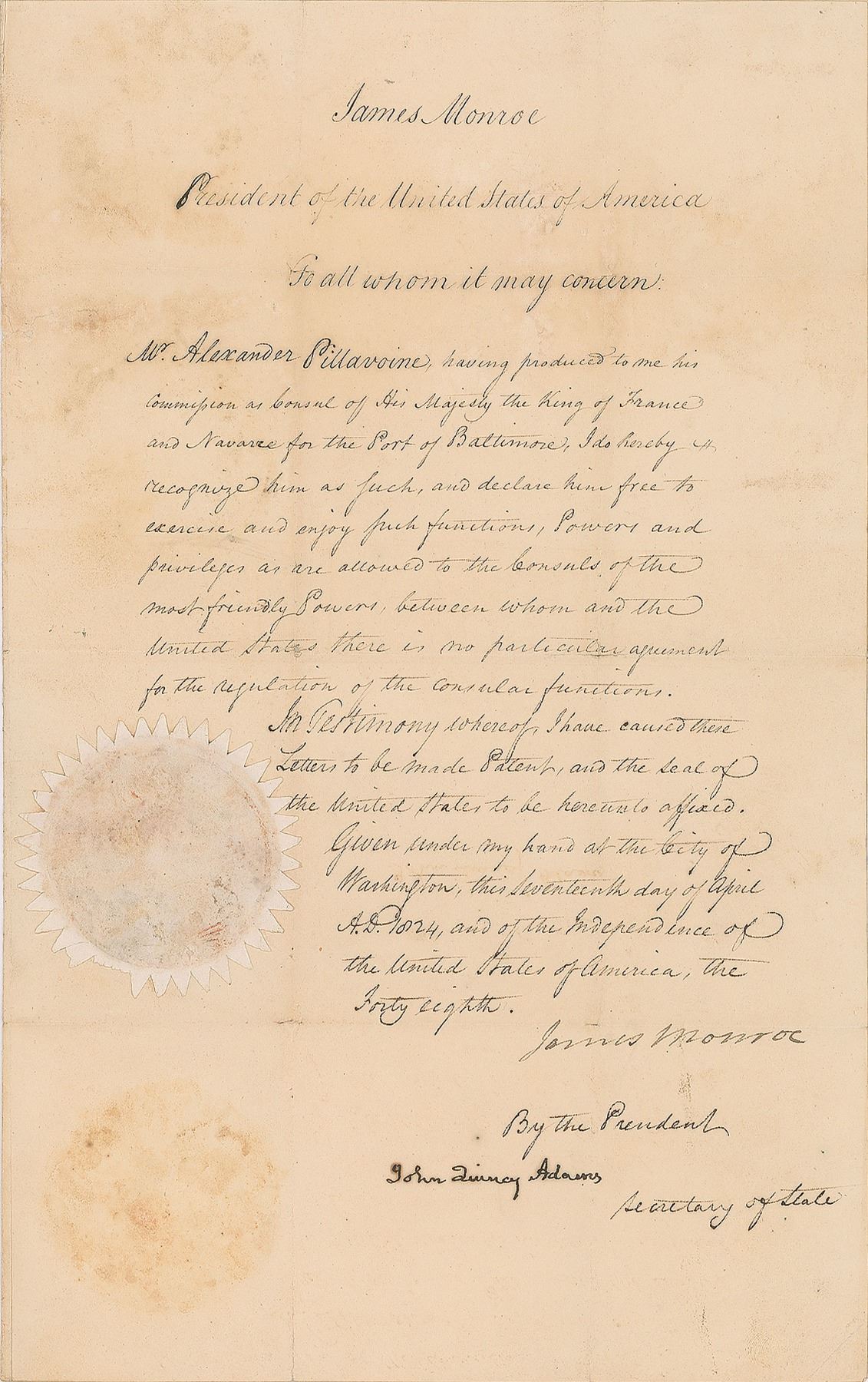 LS, signed “James Monroe” as president and “John Quincy Adams” as secretary of state, one page, 9 x 14.5, April 17, 1824. Official letter, in part: "Mr. Alexander Pillavoine, having produced to me his commission as Consul of His Majesty the King of France and Navarre for the Port of Baltimore, I do hereby recognize him as such, and declare him free to exercise and enjoy such functions, Powers and privileges as are allowed to the Consuls of the most friendly Powers. Signed at the conclusion by President Monroe and countersigned by Secretary of State John Quincy Adams. The white paper seal affixed to the left side is soiled but intact. In very good condition, with intersecting folds, light toning, and some dampstaining.
