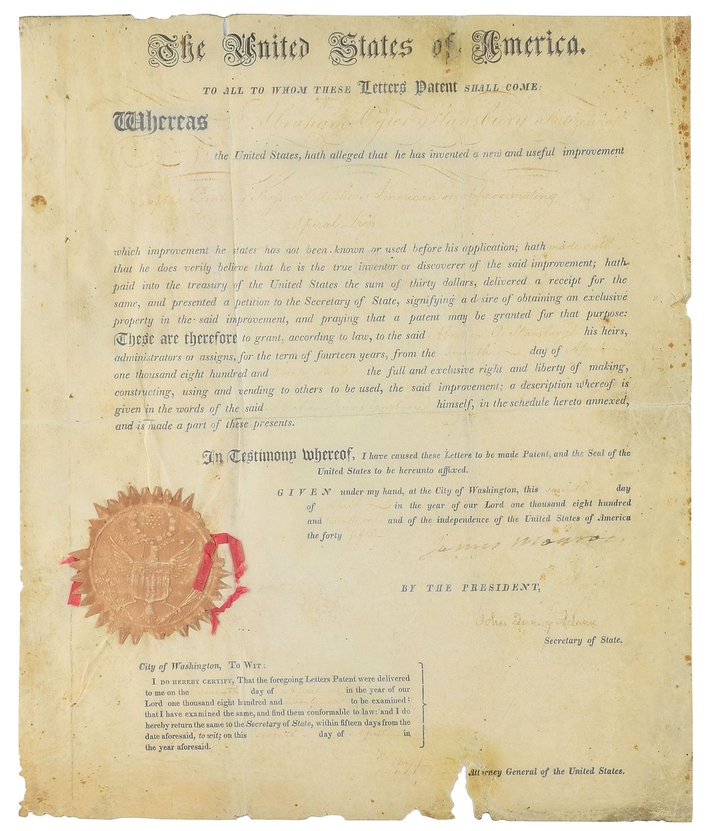 Partly-printed vellum DS, signed "James Monroe" as president and "John Quincy Adams" as secretary of state, two pages, 12 x 14.5, April 7, 1821. A patent issued to Abraham O. Stansbury for a "new and useful improvement of the Printing Press called the American or approximating Spiral Press." Signed at the conclusion by President Monroe and countersigned by Secretary of State Adams. The nicely embossed seal affixed to the lower left remains mostly intact, with partially intact red ribbon. The second page contains Stansbury's description of his invention. In very good condition, with soiling, toning, foxing, and vellum loss along the edges.