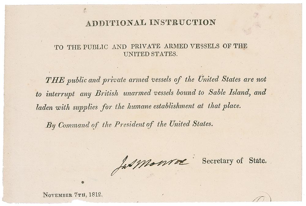 Even during war, civility held its place, hence this presidential order to allow safe passage of any unarmed British ship “laden with supplies for the humane establishment” of Sable Island. During the War of 1812, this island—situated a few hundred miles southeast of Halifax, Nova Scotia—was known as the ‘graveyard of the Atlantic.’ The exposed part of a sand shoal that stretches for more than 100 miles was responsible for hundreds of shipwrecks. In 1801, the British built a lifesaving station on the largely uninhabitable barrier island, with a lifesaving crew the first inhabitants of the island. Via this document, Monroe guaranteed that the British station would continue to function and assist sailors in need.