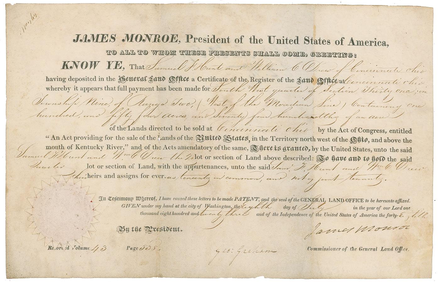 Partly-printed DS as president, one page, 13 x 8.5, July 8, 1823. President Monroe grants a 154 acre parcel of land in Ohio to Samuel Hunt and William Drew. Signed at the conclusion by Monroe and countersigned by the Commissioner of the General Land Office George Graham. In very good condition, with intersecting folds, one through a single letter of signature, scattered toning and soiling, a few small pinholes of paper loss along folds, and some light wrinkling. The white seal is intact and slightly worn.