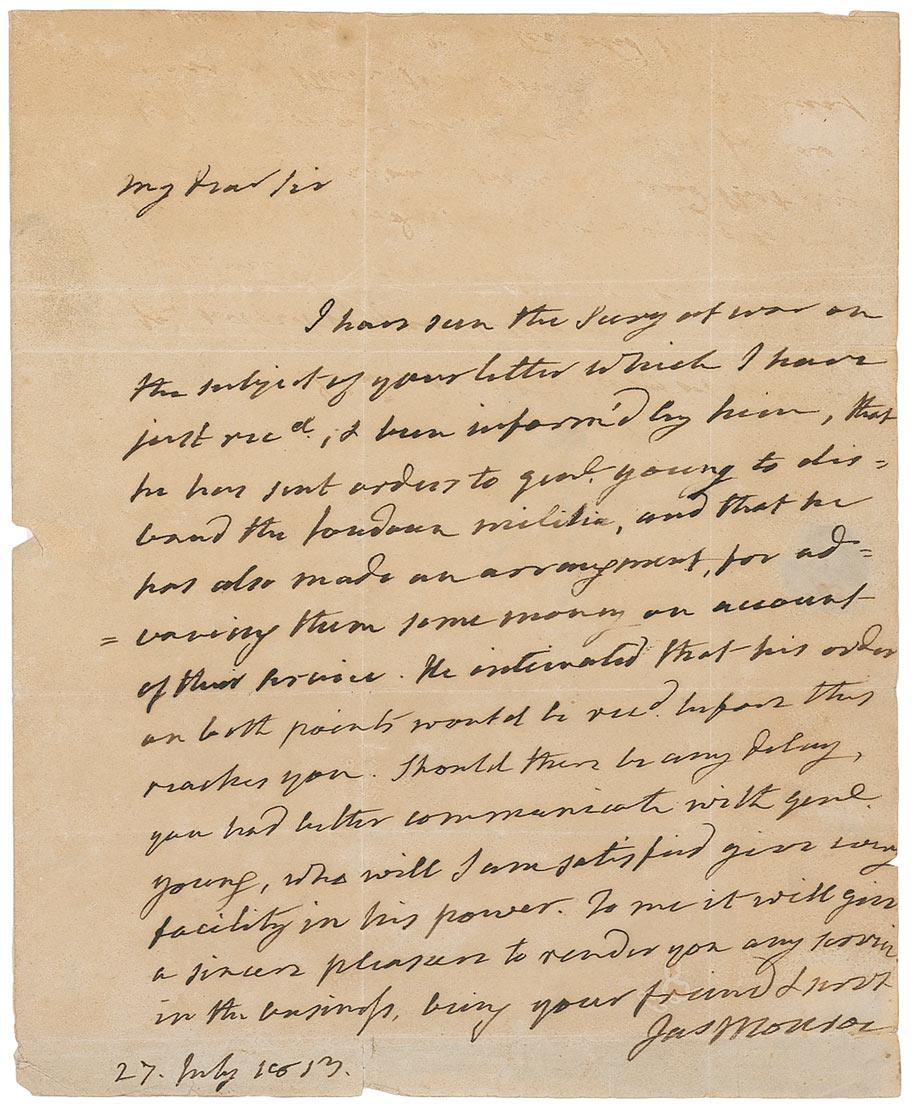 War-dated ALS signed “Jas Monroe,” one page, 7.75 x 9.5, July 27, 1813. Letter to Charles Mercer in Alexandria. In full: “I have seen the Sec'y of War on the subject of your letter which I have just rec'd, & been inform'd by him, that he has sent orders to Gen'l Young to disband the Loudoun militia, and that he has also made an arrangement for advancing them some money on account of their service. He intimated that his order on both points would be rec'd before this reaches you. Should there be any delay, you had better communicate with Gen'l. Young, who will I am satisfied give every facility in his power. To me it will give a sincere pleasure to render you any service in the business.” Second integral page bears an address panel in Monroe’s hand. A few small partial separations along several intersecting folds, some through portions of signature, scattered toning, wrinkling, and creasing, a few edge chips, and light mirroring of text along top edge, otherwise very good condition.