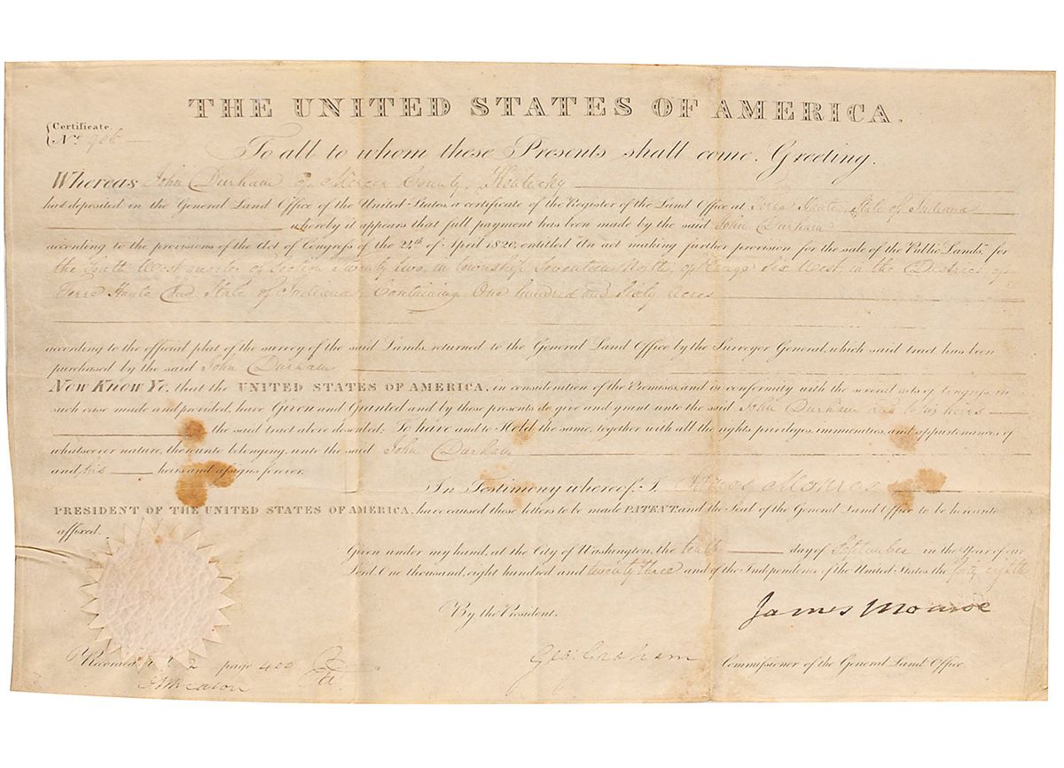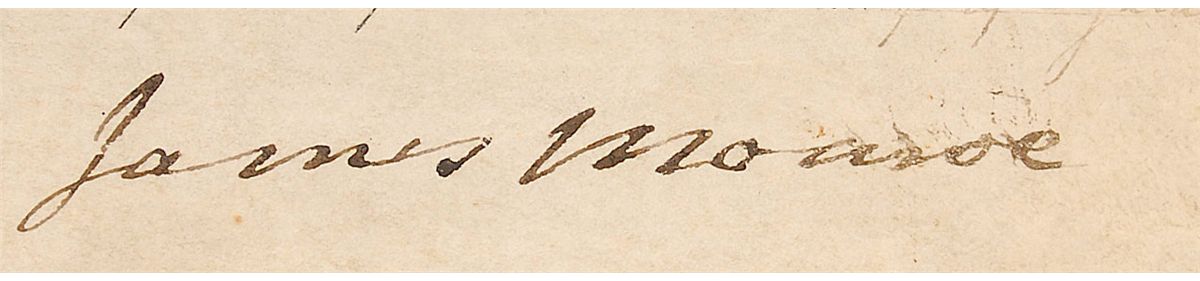 Partly-printed DS as president, one page, 16 x 9.75, September 10, 1823. President Monroe grants John Durham 160 acres of land in Indiana. Boldly signed at the conclusion by Monroe and countersigned by Commissioner of the General land Office George Graham. In very good condition, with intersecting folds, some feathering to end of Monroe’s signature, mild wrinkling, and several areas of toning.