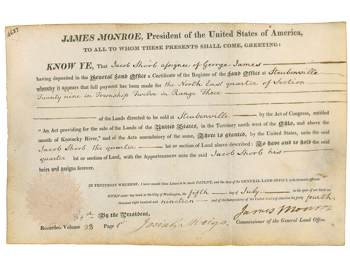 Partly-printed rigid vellum DS as president, one page, 13 x 8.5, July 5, 1819. President Monroe grants 80 acres of land in Ohio to Jacob Short. Signed at the conclusion by Monroe, and countersigned by the Commissioner of the General Land Office Josiah Meigs. Intersecting folds, and scattered light toning and soiling, otherwise fine condition. The white seal is lightly toned and worn, but intact.