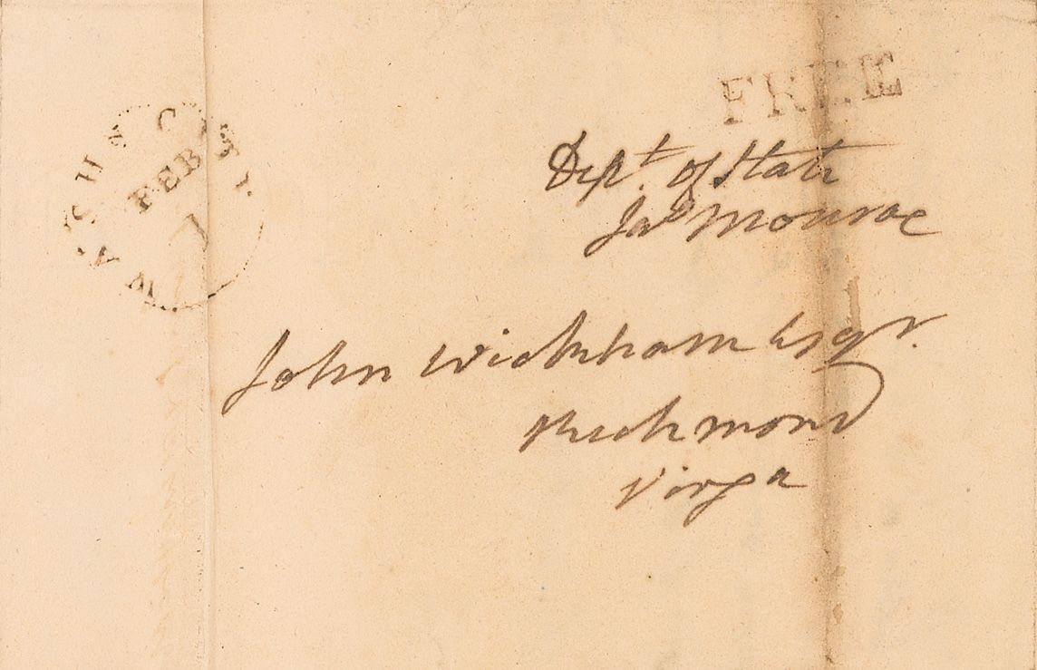 ALS signed “Jas Monroe,” one page, 7.75 x 9.5, February 1, 1816. Letter, written as secretary of state, to John Wickham. In full: “I have received your late letter respecting the sum. I am indebted on account of the stock of the late N. Martin of Albemarle county. My object in this is to acknowledge the receit [sic] of that letter & to assure you that I will answer it more fully in a few days. My pressing engagments [sic] at this time, in some interesting foreign concerns, p[ut] it out of my power to do it; either to yours or my satisfaction. I am Dear sir with great respect & esteem yr very obt servt.” Reverse of second integral page bears a hand-addressed and free franked address panel by Monroe to “John Wickham, Esq., Richmond, Virga,” and franked in the upper right, “Dept of State, Jas Monroe,” below a Free stamp. Panel also bears a February 1, Washington City postal cancellation. In very good condition, with intersecting folds, one through a single letter of signature, scattered toning and soiling, a couple small holes to right edge affecting a single word of text, another small hole to upper left, and a few fold separations and paper loss to second integral page. Letter is housed in a custom-made two-fold hardcover portfolio.