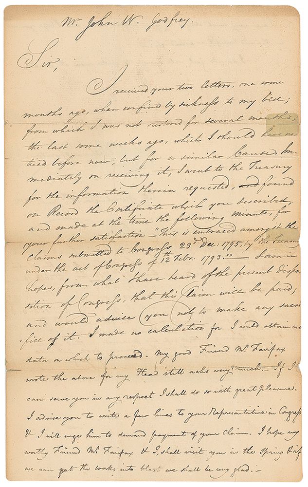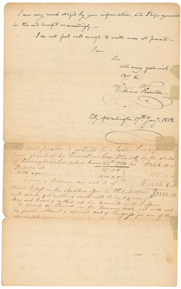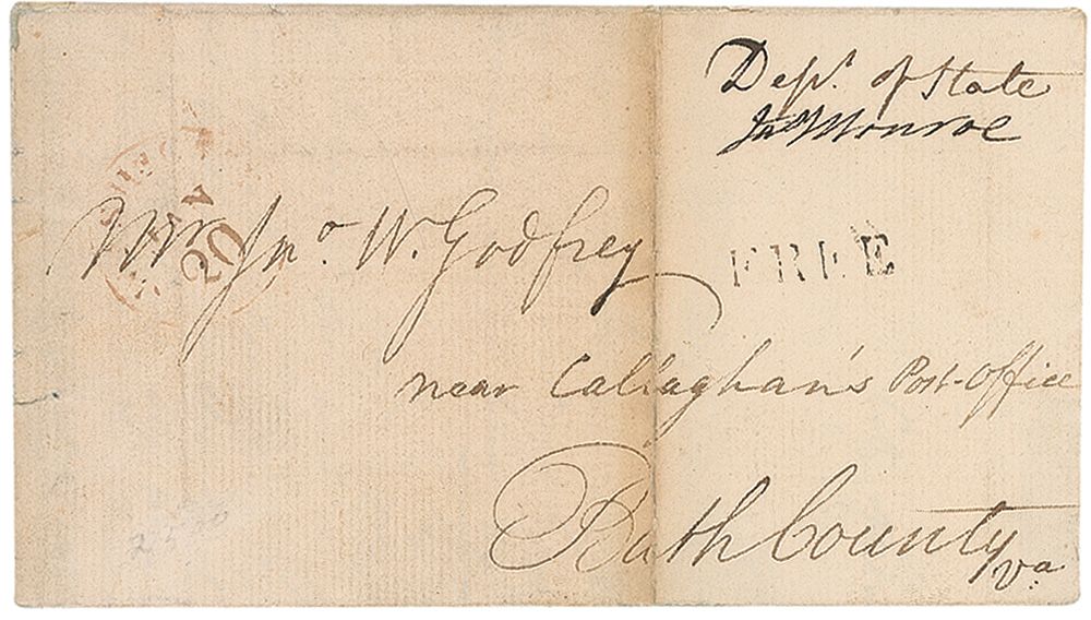 Full free frank, measuring 12.75 x 8 unfolded, with panel measuring 5.5 x 3, addressed in another hand to “Mr. Jno W. Godfrey, near Callaghan’s Post Office, Bath County, Va,” and franked in the upper right of the panel, “Jas Monroe.” The letter written by William Thornton to John Godfrey is included and reads, in part: “I received your two letters, one some months ago, when confined by sickness to my bed, from which I was not recovered for several months; the last some weeks ago, which I should have notices before now, but for a similar cause. Immediately on receiving it, I went to the Treasury for information there-in requested, found on record the certificate which you described, and made at the time the following minute for your further satisfaction.—’This embraced amongst the claims submitted to Congress of the 12th Febr. 1793’—I am in hopes from what I have heard of the present disposition of Congress, that this claim will be paid; and would advise you not to make any sacrifice of it. I made no calculation for I could obtain no data on which to proceed.” Partial separations along folds, several tape repairs to folds, some edge tears, and toning to left half of panel, otherwise very good condition.