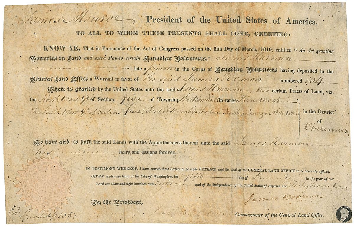Partly-printed DS as president, one page, 13.25 x 8.5, January 5, 1818. President Monroe grants two tracts of land to James Harmon, a private in the Canadian volunteers under “An act granting bounties in land and extra pay to certain Canadian volunteers.” Signed at the conclusion by Monroe and countersigned by Commissioner of the General Land Office Josiah Meigs. In good condition, with moderate intersecting folds, scattered toning and wrinkling, Monroe’s signature light, but legible, a small clipped portrait affixed to lower right, and mounting remnant to reverse. The seal is worn, but mostly intact.