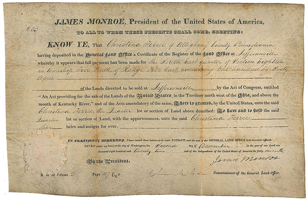 Partly-printed DS as president, one page, 13.75 x 9, December 2, 1822. Land grant issued to Christina Feree of Pennsylvania for 160 acres of land, signed at the conclusion by Monroe and countersigned by commissioner of the general land office. Intersecting folds, mild toning along the folds, and mild overall soiling, otherwise very good condition. The white wafer seal is worn, but intact.