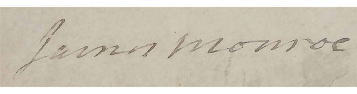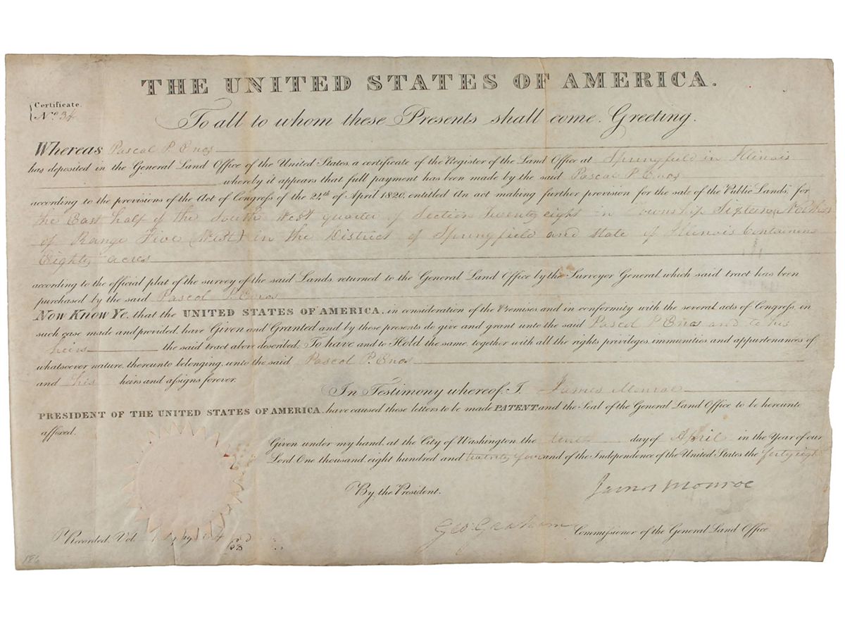 Partly-printed DS as president, one page, 15.5 x 9.5, April 10, 1824. President Monroe grants Pascal P. Enos 80 acres of land in Illinois. Signed at the conclusion by Monroe and countersigned by Commissioner of the General Land Office George Graham. In very good condition, with five vertical folds, one through a single letter of signature, handwritten portions a shade or two light, and some light toning along folds. The white wafer seal is worn, but intact.
