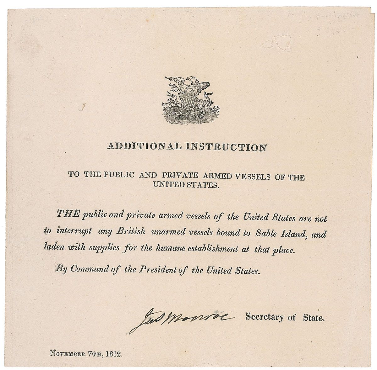 War-dated DS, signed “Jas Monroe,” one page, 7.75 x 7.75, November 7, 1812. Directives to “the public and private armed vessels of the United States,” prohibiting them from interfering with “any British unarmed vessels bound to Sable Island and laden with supplies for the humane establishment at that place.” Signed at the conclusion by Monroe as secretary of state. In fine condition, with central horizontal and vertical folds, one through a single letter of signature, and a small area of paper loss to upper right and bottom edge.