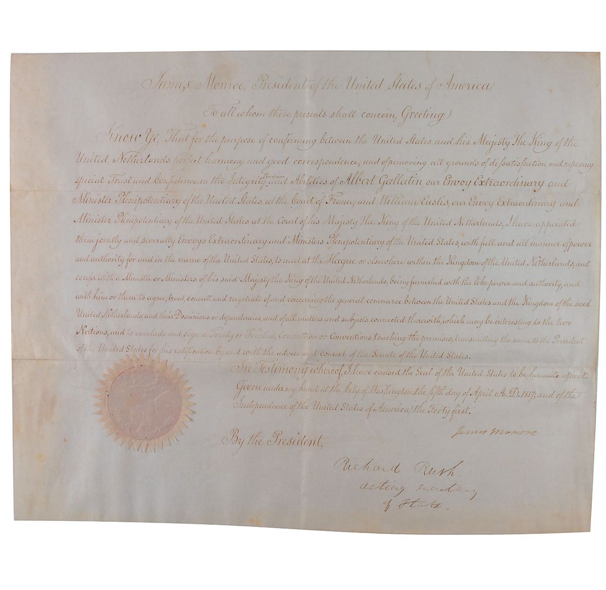 Manuscript vellum DS as president, one page, 17.5 x 14.5, April 5, 1817. Diplomatic appointment reads, in part: “That for the purpose of confirming between the United States and his Majesty The King of the United Netherlands perfect harmony and good correspondence, and of removing all grounds of dissatisfaction and reposing special Trust and Confidence in the Integrity, Prudence, and Abilities of Albert Gallatin, our Envoy Extraordinary and Minister Plenipotentiary of the United States at the Court of France, and William Eustis, our Envoy Extraordinary and Minister Plenipotentiary of the United States at the Court of his Majesty the King of the United Netherlands, I have appointed them jointly and severally Envoys Extraordinary and Ministers Plenipotentiary of the United States with full and all manner of power and authority for and in the name of the United States, to meet at the Hague or elsewhere within the Kingdom of the United Netherlands, and confer with a Minister of Ministers of his said Majesty…to agree, treat, consult, or negotiate of and concerning the general commerce between the United States and the Kingdom…and to conclude or and sign a Treaty or Treaties, Convention or Conventions…transmitting the same to the President of the United States.” Signed at the conclusion by Monroe and countersigned by the Acting Secretary of State Richard Rush. In fine condition, with intersecting folds, some scattered toning, mainly to edges, and light wrinkling.