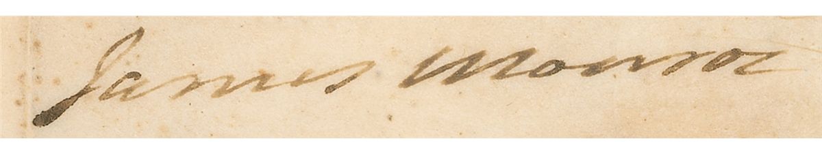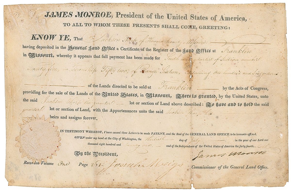 Partly-printed DS as president, one page, 13 x 8.75, July 30, 1821. President Monroe grants Jackson Thorp 160 acres of land in Missouri. Signed at the conclusion by Monroe and countersigned by Commissioner of the General Land Office Josiah Meigs. Document is affixed to a slightly smaller piece of cardstock. Intersecting folds, some scattered light paper loss, mainly to a vertical fold, trimmed edges, and scattered toning and foxing, otherwise very good condition. The seal is toned and slightly worn, but intact.