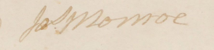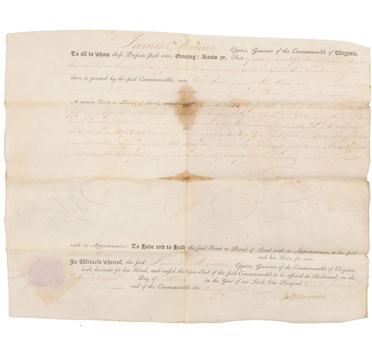 Partly-printed vellum DS, signed “Jas. Monroe,” one page, 14.75 x 11.75, May 28, 1800. As governor of Virginia, Madison grants Robert Preston a “certain Tract or Parcel of Land, containing Two hundred and Eighty five Acres…in the County of Russell.” Paper seal affixed to lower left remains fully intact. In very good condition, with heavy intersecting storage folds and scattered staining (mostly to center).
