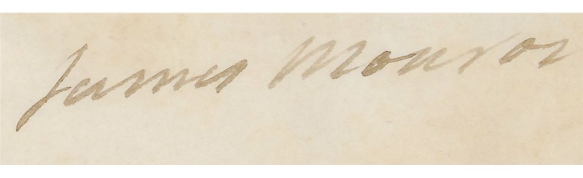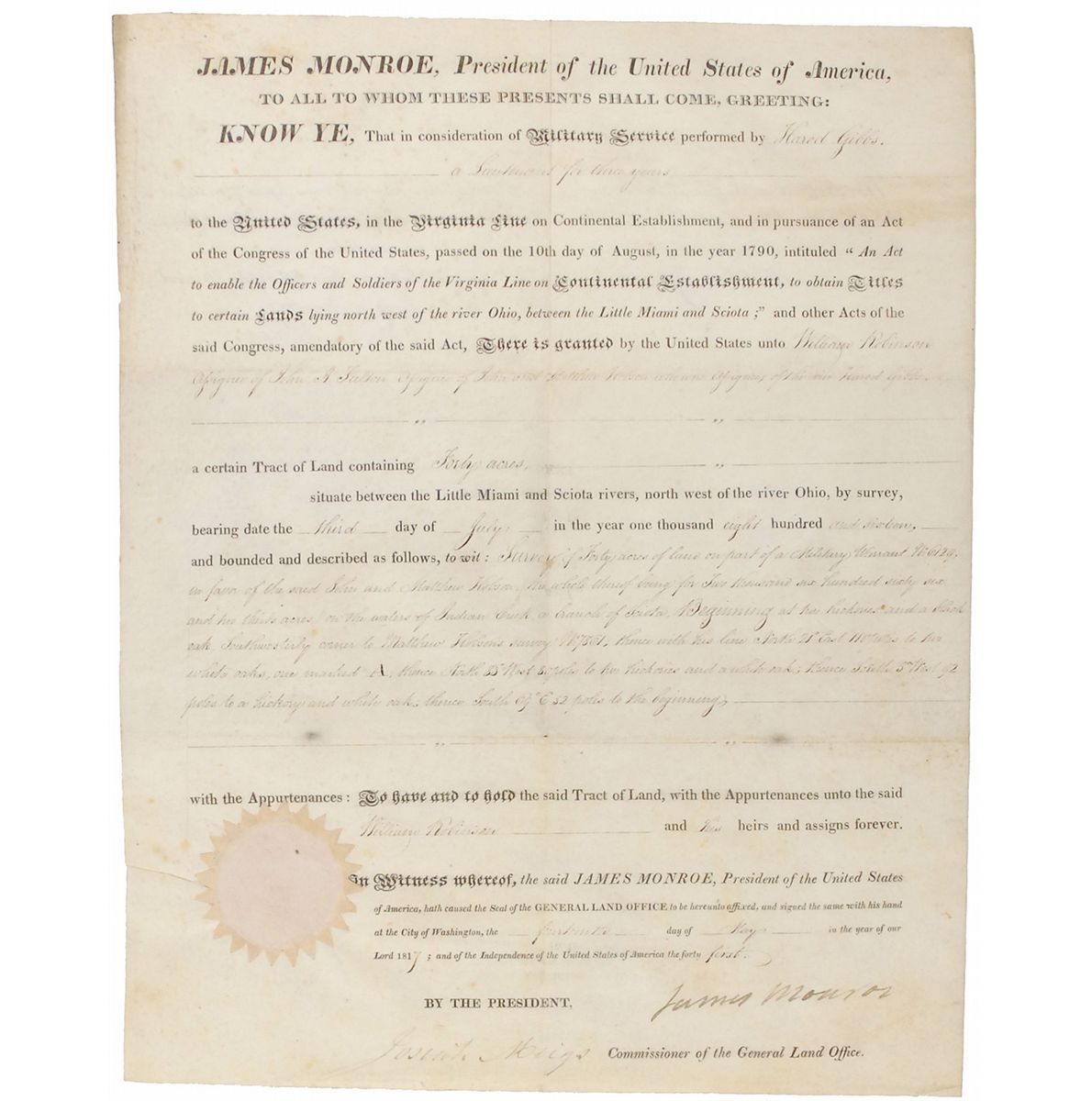 Partly-printed vellum DS as president, one page, 11.75 x 14.5, May 14, 1817. President Monroe grants 40 acres of land in the Northwest Territory to Harod Gibbs, “a Lieutenant for three years, to the United States, in the Virginia Line on Continental Establishment, and in pursuance of an Act of the Congress of the United States passed on the 10th day of August, in the year 1790, intituled ‘An Act to enable the Officers and Soldiers of the Virginia Line on Continental Establishment, to obtain Titles to certain Lands lying north west of the river Ohio, between the Little Miami and Sciota.’” Signed at the conclusion by Monroe and countersigned by Commissioner of the General Land Office Josiah Meigs. Intersecting folds and some scattered light toning, otherwise fine condition. The white wafer seal is lightly toned, but crisp and intact.