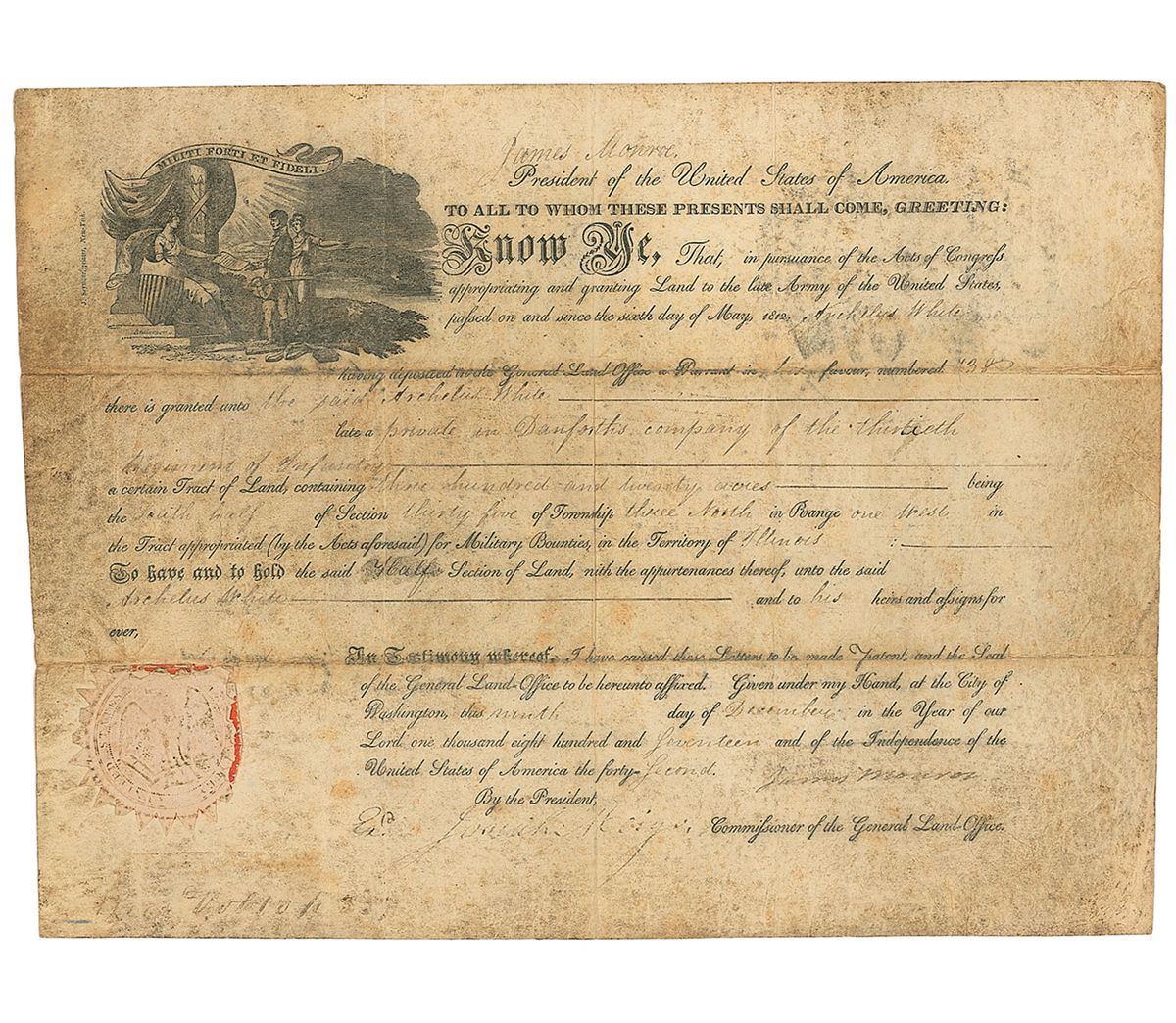 Partly-printed vellum DS as president, one page, 13 x 10, December 9, 1817. President Madison grants Archelus White, “late a private in Danforth’s company of the thirtieth regiment of Infantry a certain Tract of Land containing three hundred and twenty acres…in the Territory of Illinois.” Signed at the conclusion by Monroe and countersigned by Commissioner of the General Land Office Josiah Meigs. Document retains its white paper seal affixed to the lower left, with some chipping to edges. Intersecting folds (one vertical fold passing through a single letter of the signature), significant overall staining and soiling affecting the appearance, and signatures a shade or two light, otherwise very good condition.