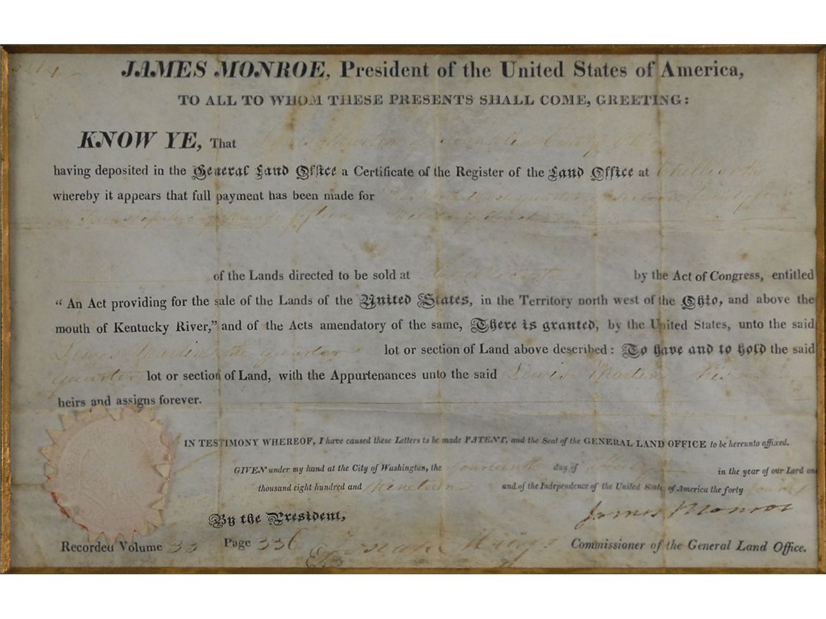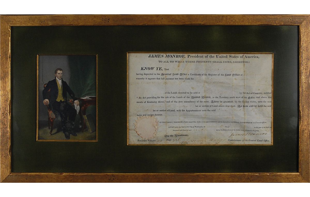 Partly-printed DS as president, one page, 12 x 7.75, July 14, 1819. President Monroe grants a quarter lot of land in Ohio to Lewis Murdin. Signed at the conclusion by Monroe and countersigned by Commissioner of the General land Office Josiah Meigs. Cloth-matted and framed with a color portrait of Monroe to an overall size of 26.5 x 14.5; the frame back bears the printed certificate of authenticity label and red wax seal of noted dealer Charles Hamilton. In good condition, with intersecting folds, one through a single letter of signature, mild wrinkling and rippling, and handwritten portions of the document very light, but still mostly legible. The white seal is worn and creased, but intact. Oversized.