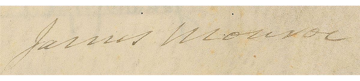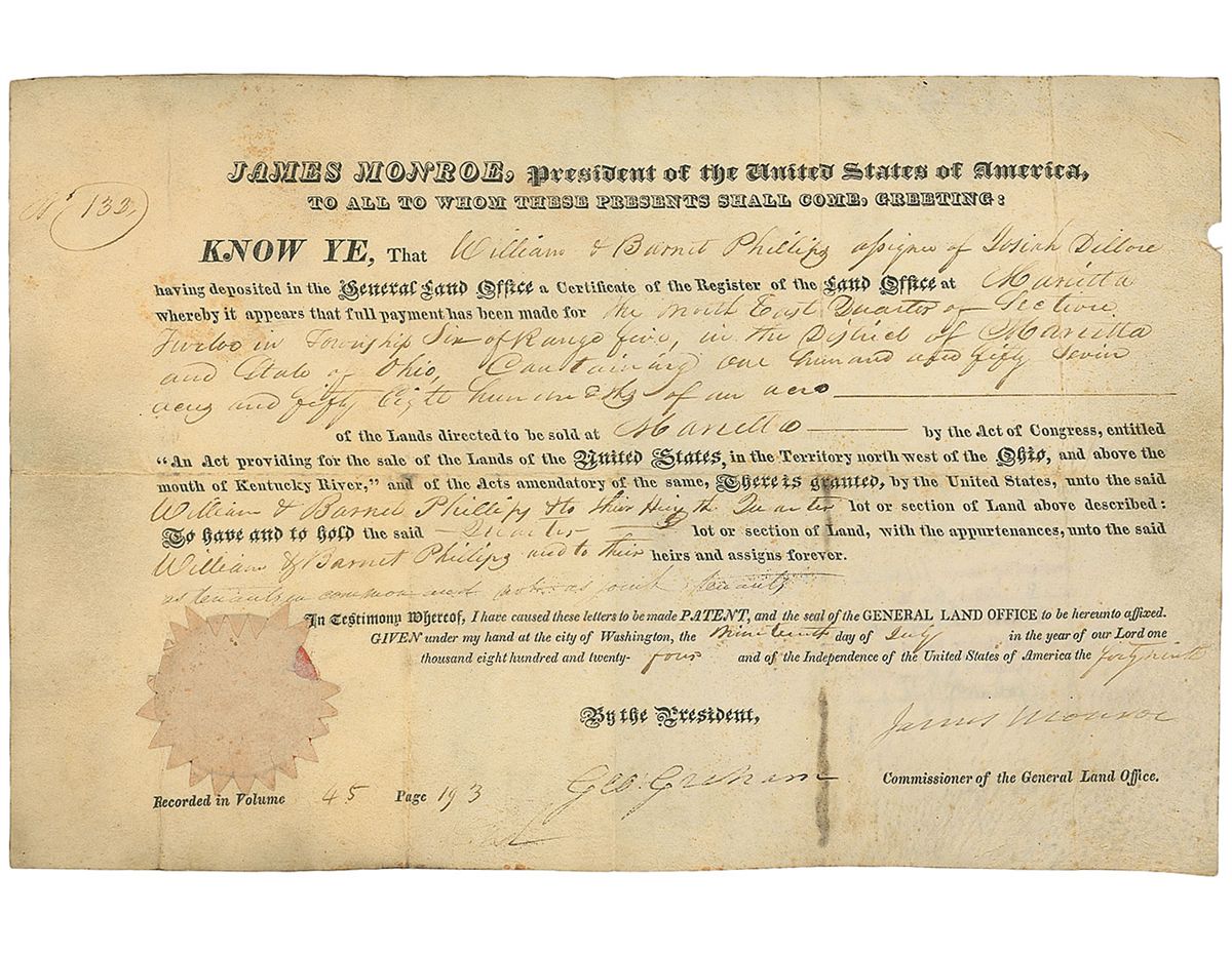 Partly-printed vellum DS as president, one page, 13.75 x 9, July 19, 1824. President Monroe grants William and Barnet Philips a parcel of land in Marietta, Ohio, “containing one hundred and fifty seven acres, and fifty eight hundredths of an acre.” Signed at the conclusion by President Madison and countersigned by Commissioner of the General Land Office Josiah Meigs. The white paper seal affixed to lower left remains intact. In very good condition, with intersecting folds (one vertical fold passing through a single letter of the signature), a few stains, and trivial paper loss to the right edge.