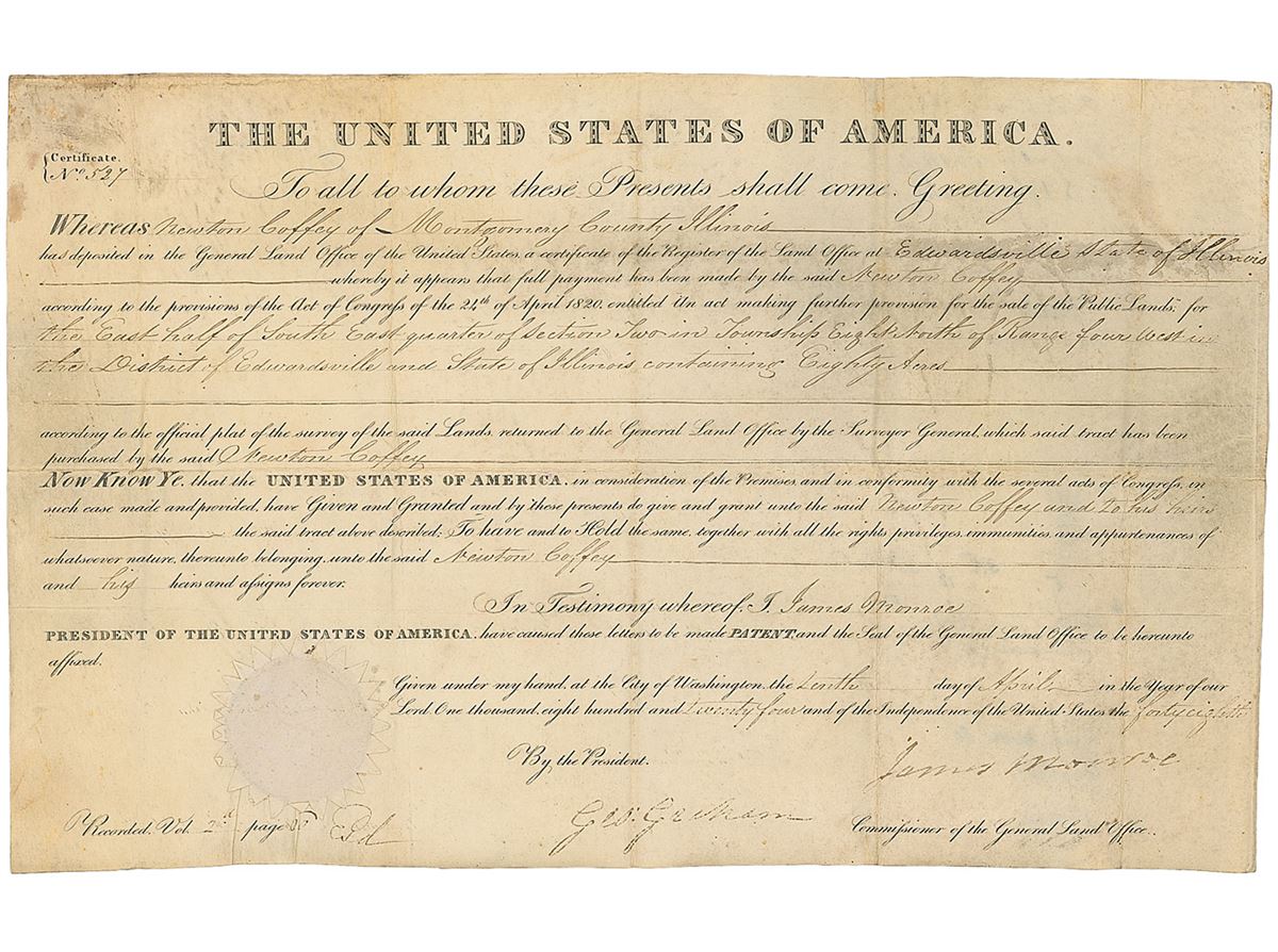 Partly-printed vellum DS as president, one page, 15.25 x 9.75, April 10, 1824. President Monroe grants Newton Coffey of Montgomery County, Illinois, a parcel of land “in the District of Edwardsville and State of Illinois containing Eighty Acres.” Signed at the conclusion by President Monroe and countersigned by Commissioner of the General Land Office George Graham. The white paper seal affixed to the lower left remains clean and fully intact. Intersecting folds (two vertical folds passing through letters of the signature), and scattered staining and soiling, otherwise fine condition.