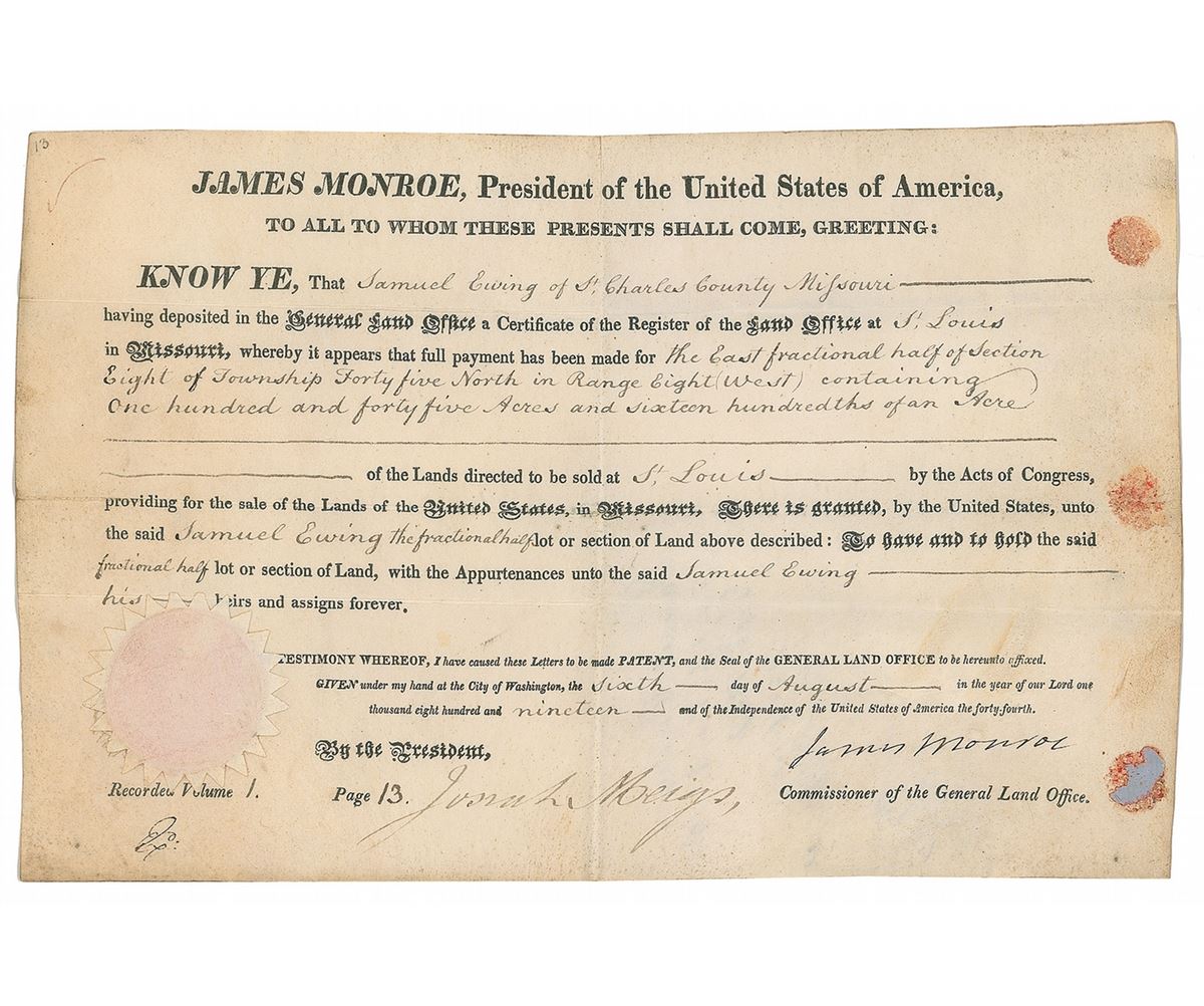 Partly-printed vellum DS as president, one page, 13.25 x 8.5, August 6, 1819. President Monroe grants James Ewing of St. Charles County, Missouri, a parcel of “one hundred and forty five Acres and sixteen hundredths of an Acre of the Lands directed to be sold at St. Louis.” Boldly signed at the conclusion by President Monroe and countersigned by Commissioner of the General Land Office Josiah Meigs. The white paper seal affixed to the lower left remains fully intact. Intersecting folds, soiling and seal remnants to edges, and expected document wear, otherwise fine condition.