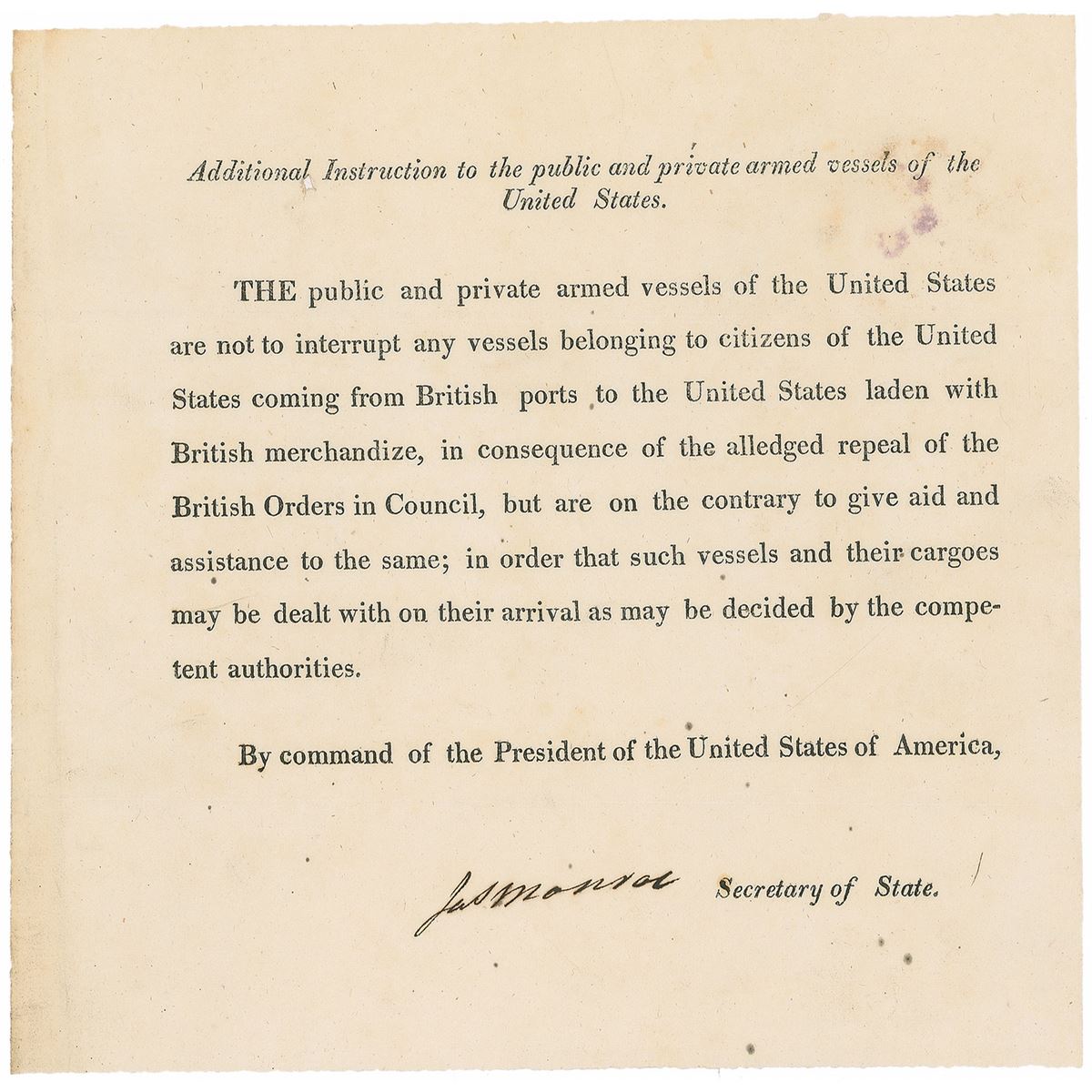 War–dated DS as secretary of state, signed “Jas. Monroe,” one page, 7.75 x 7.5, no date but circa 1812. Printed State Department circular issued “by command of the President of the United States of America.” In part: “The public and private armed vessels of the United States are not to interrupt any vessels belonging to citizens of the United States coming from British ports to the United States laden with British merchandize, in consequence of the alledged repeal of the British Orders in Council, but are on the contrary to give aid and assistance to the same; in order that such vessels and their cargoes may be dealt with on their arrival as may be decided by the competent authorities.” In fine condition, with expected document wear, soiling to upper right, and a small hole below the heading.