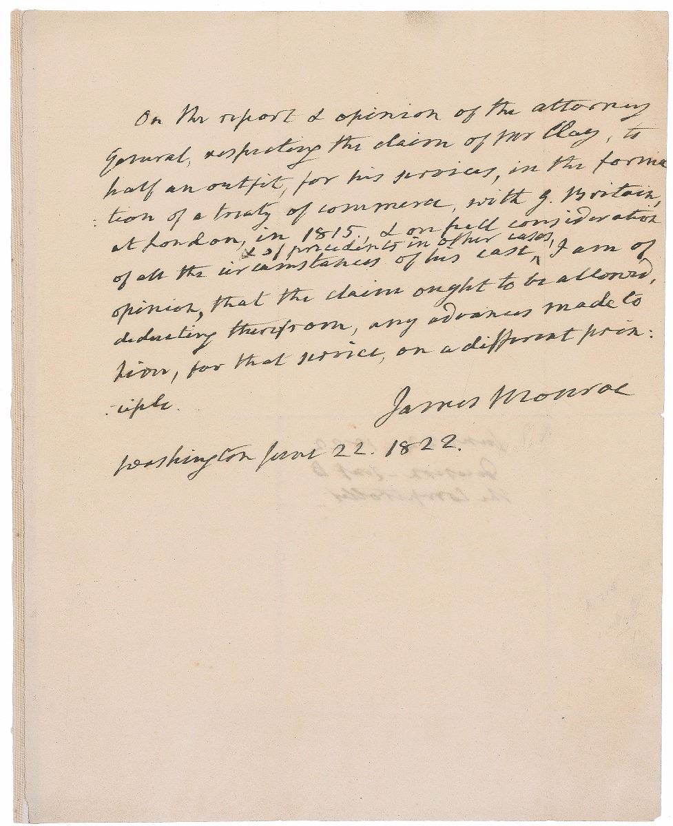 ALS as president, one page, 8 x 10, June 22, 1822. Letter to the comptroller. In full: “On the report & opinion of the Attorney General, respecting the claim of Mr. Clay, to half an outfit, for his services, in the formation of a treaty of commerce, with G. Britain, at London, in 1815, & on full consideration of his case, & of precedents in other cases, I am of the opinion, that the claim ought to be allowed, deducting there from, any advances made to him, for that service, on a different principle.” In fine condition, with intersecting folds and show-through from docketing on the reverse.