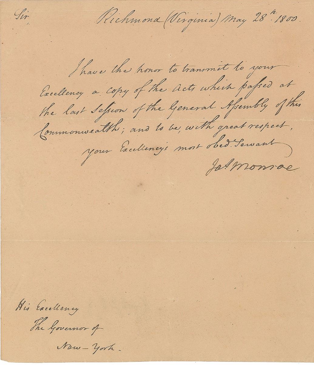 LS signed “Jas. Monroe,” one page, 7.25 x 8.75, May 28, 1800. Letter to Governor John Jay of New York, written by Monroe while serving as governor of Virginia. In full: “I have the honor to transmit to your Excellency a copy of the Acts which passed at the last Session of the General Assembly of the Commonwealth.” In fine condition.