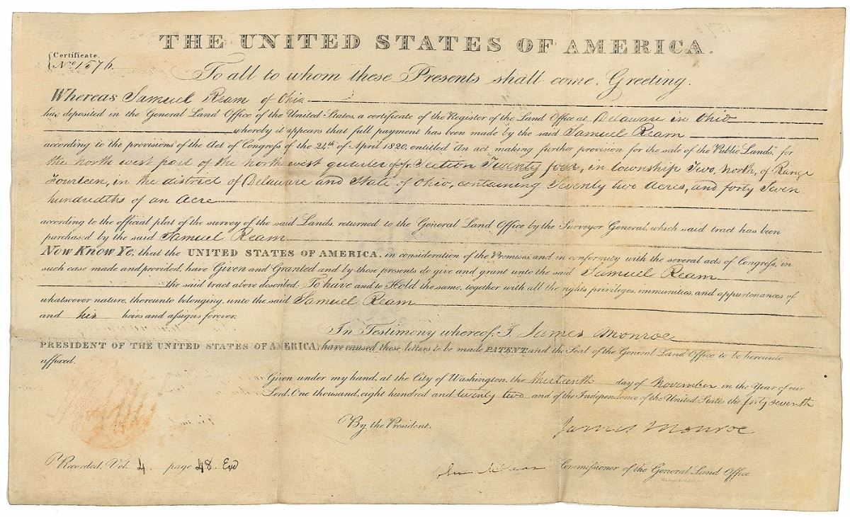 Partly-printed vellum DS as president, one page, 16 x 9.75, November 13, 1822. President Monroe grants Samuel Ream of Ohio a parcel of land “containing Seventy two acres.” Signed at the conclusion by President Monroe and countersigned by Commissioner of the General Land Office John McLean. Seal to lower left is absent. In very good condition.