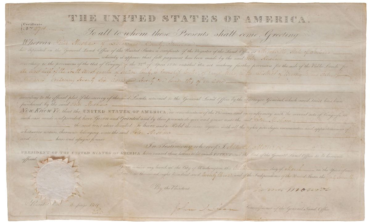 Partly-printed vellum DS as president, one page, 16 x 10, March 10, 1823. President Monroe grants Peter Hushaw of Delaware County, Indiana, a parcel of land “in the District of Brookville…containing seventy six acres.” Signed at the conclusion by President Monroe and countersigned by Commissioner of the General Land Office John McLean. The white paper seal affixed to the lower left remains intact. In very good condition.
