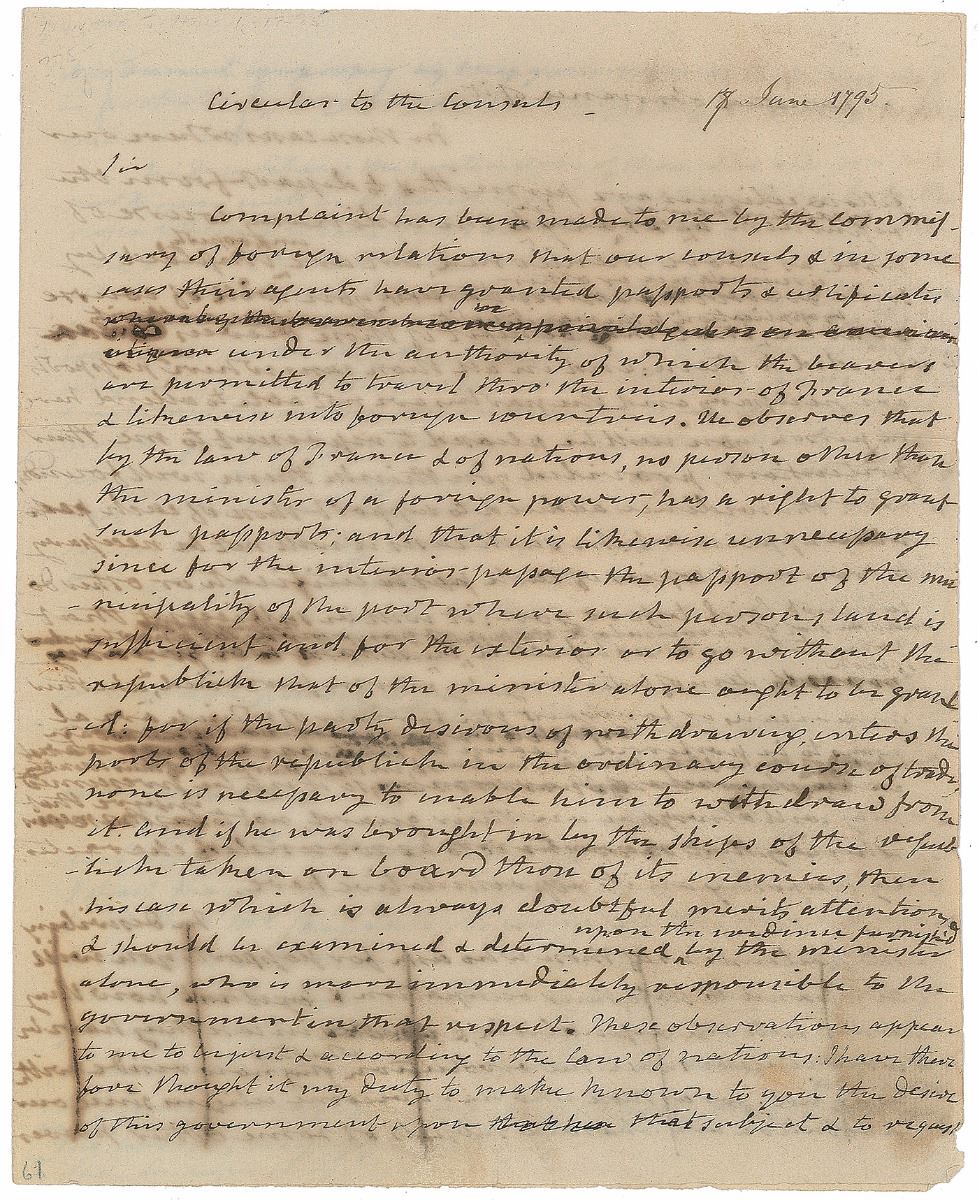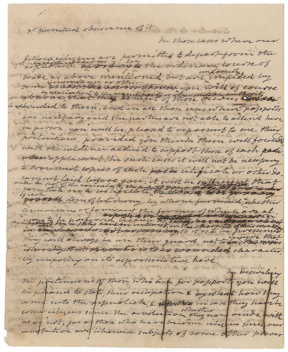 Lengthy handwritten draft as US minister to France, unsigned, three pages on two adjoining sheets, 7.25 x 9, June 18, 1795. Draft headed “Circular to the Consuls,” in part: “Complaint has been made to me by the commissary of foreign relations that our consuls & in some cases their agents have granted passports & certificates under the authority of which the bearers are permitted to travel thro’ the interior of France & likewise into foreign countries. He observes that by the law of France & of nations, no person other than the minister of a foreign power, has a right to grant such passports; and that it is likewise unnecessary…for if the party desirous of withdrawing enters the ports of the republick in the ordinary course of trade, none is necessary to enable him to withdraw from it…These observations appear to me to be just & according to the law of nations: I have therefore thought it my duty to make known to you the desire of this government upon that subject & to request yr punctual observance of it.” Docketed on the reverse in another hand. In fine condition, with small splits along hinge and show-through from writing to opposing sides.