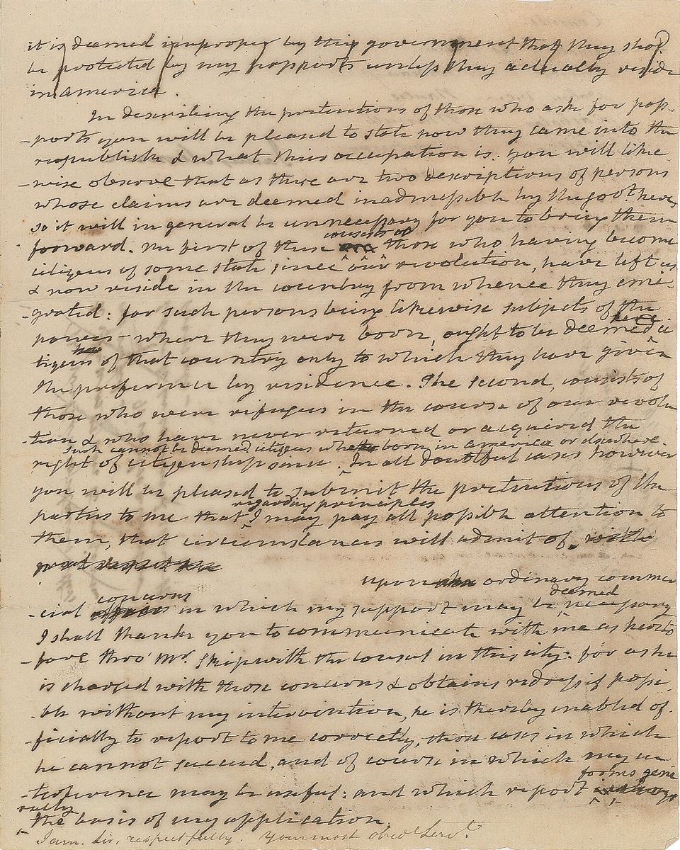 The haphazard issue of passports by American officials proved troublesome for many parties—they were entirely invalid under French law since they were not signed by the minister, people from other countries were posing as American citizens in order to obtain passports, and those entering and exiting the country had become virtually impossible to track. After Monroe wrote this draft the final circular was printed and issued to American consular officers in the hope of rectifying this problem; in doing so, Monroe also aimed to maintain good diplomatic relations with France. Given its length, early date, and historical relevance, this is an exceptionally desirable piece.