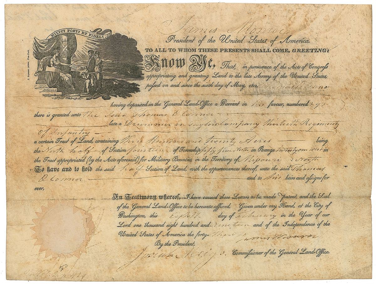Partly-printed vellum DS as president, one page, 12.75 x 9.75, February 8, 1819. President Monroe grants Thomas O’Connor “a certain Tract of Land, containing three Hundred and twenty Acres…in the Territory of Missouri: North.” Signed at the conclusion by Monroe, and countersigned by Commissioner of the General Land Office Josiah Meigs. The white paper seal affixed to the lower left remains intact. In very good condition, with moderately heavy overall soiling.