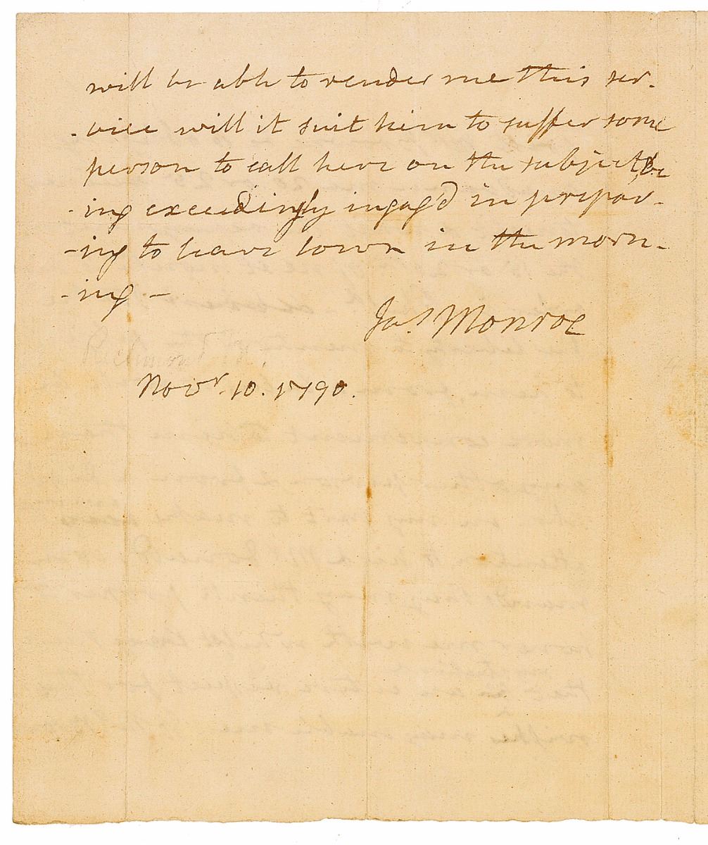 ALS signed “Jas. Monroe,” one page both sides, 6.25 x 8, November 10, 1790. Letter to Mr. Browne, in full: “Will Mr. Browne be so obliging as advance me 20 or 25 guineas tonight & wait the repayment on the 15 or 20th of next month to his order in Phil’d. I take the liberty to mention the subject to him, from a belief it will be more convenient to him than any other person & from a disposition on my part to make every attention to his & Mr. Donald’s command they may think proper to honor me with whilst there, that my situation & a certain respect for their wishes enable me. If Mr. Browne will be able to render me this service will it suit him to suffer some person to call him on the subject, being exceedingly ingaged in preparing to leave town in the morning.” In fine condition.