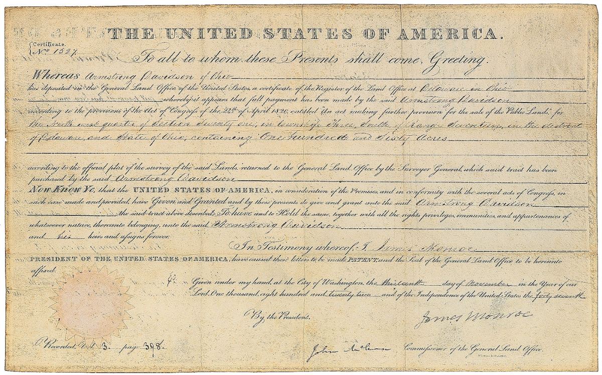 Partly-printed vellum DS as president, one page, 16 x 10, November 13, 1822. President Monroe grants Armstrong Davidson of Ohio a parcel of land “in the district of Delaware, and State of Ohio, containing One hundred and Sixty Acres.” Signed at the conclusion by President Monroe and countersigned by Commissioner of the General Land Office John McLean. The white paper seal affixed to the lower left remains fully intact. In very good to fine condition.