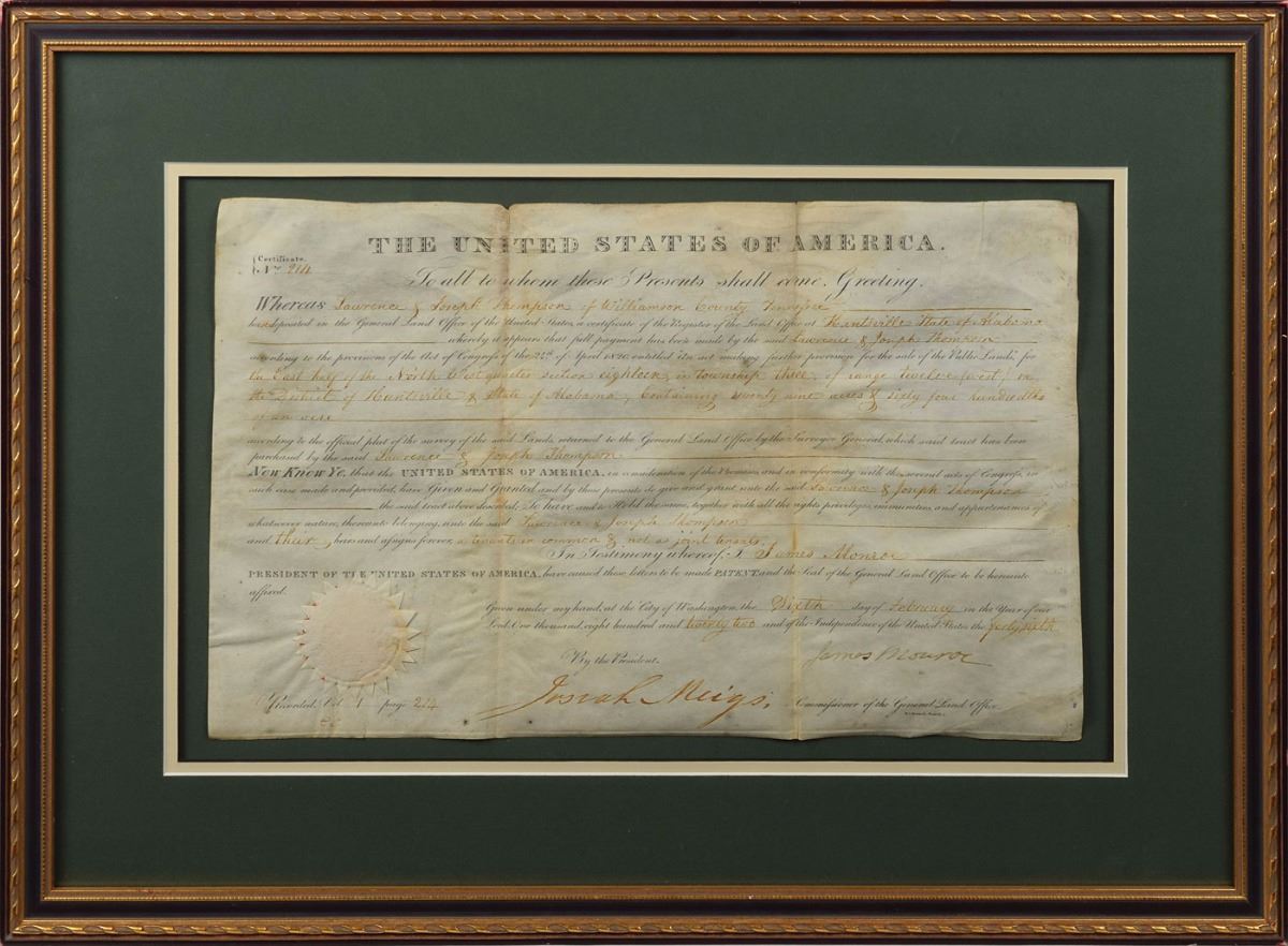 Partly-printed vellum DS as president, one page, 16 x 9.5, February 6, 1822. President Monroe grants Lawrence and Joseph Thompson a parcel of land "in the District of Huntsville & state of Alabama, Containing seventy nine acres." Signed at the conclusion by Monroe and countersigned by Commissioner of the General Land Office Josiah Meigs. The crisp white paper seal affixed to the lower left remains fully intact." Nicely mounted, double-matted, and framed to an overall size of 23.5 x 16.5. In very good to fine condition, with scattered light toning.