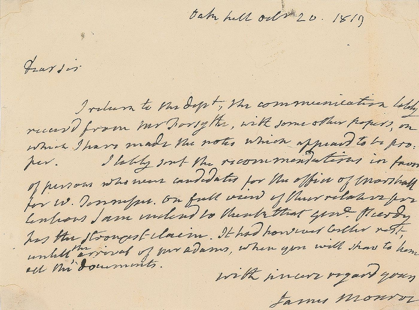 ALS as president, one page, 7.75 x 5.75, October 20, 1819. Boldly penned letter to a gentleman, written from his Oak Hill plantation, in part: "I return to the dept., the communication lately received from Mr. Forsyth, with some other papers, on which I have made the notes which appeared to be proper. I lately sent the recommendations in favor of persons who were candidates for the office of marshall for W. Tennessee…I am inclined to think that Gen'l Purdy has the strongest claim." The closing line refers to "the arrival of Mr. Adams," a reference to John Quincy Adams, who was Secretary of State in Monroe's cabinet. In fine condition. Robert Purdy, a veteran of the Revolution and War of 1812, was indeed appointed as marshal for the Western District of Tennessee, and confirmed by the Senate on October 22, 1819.