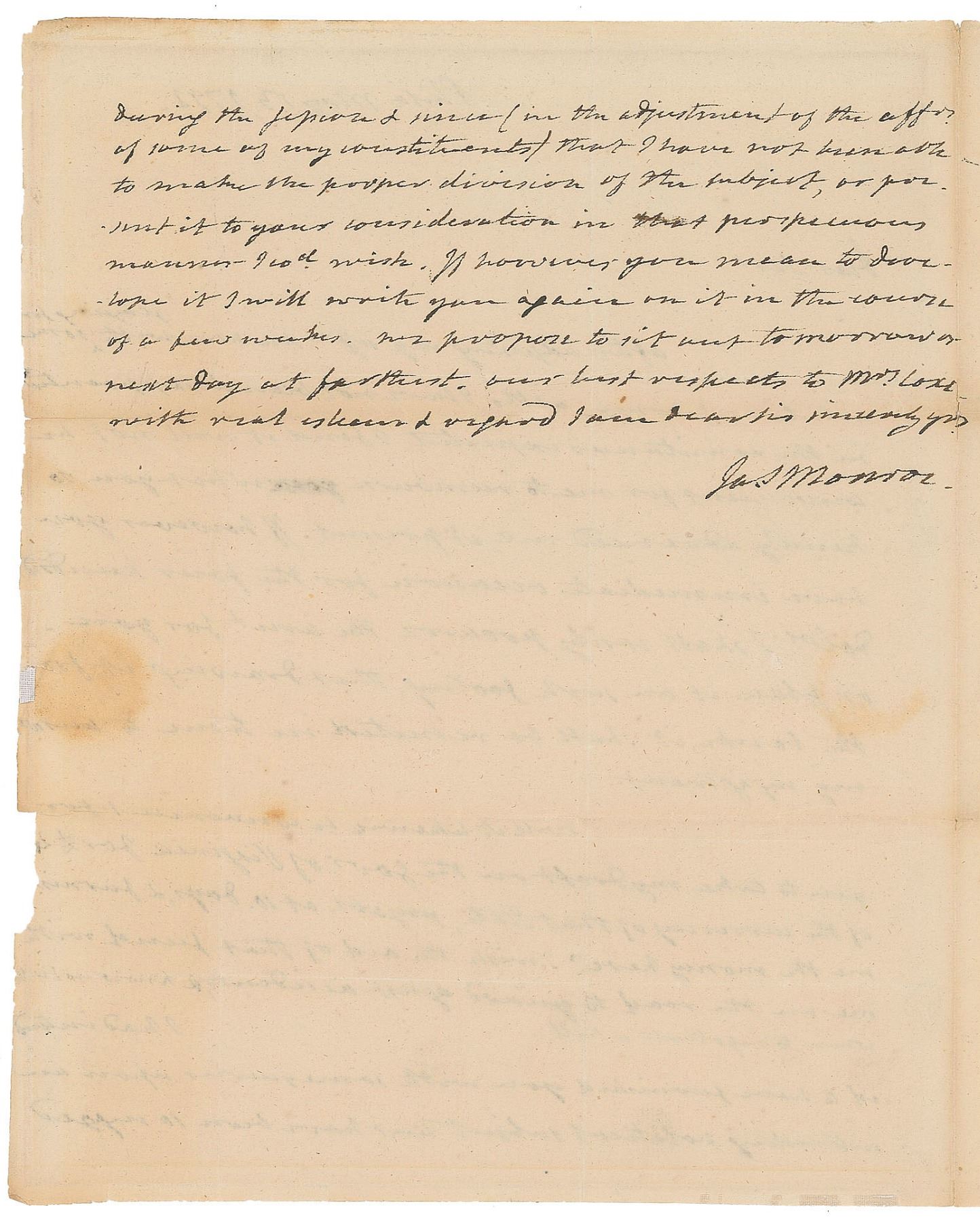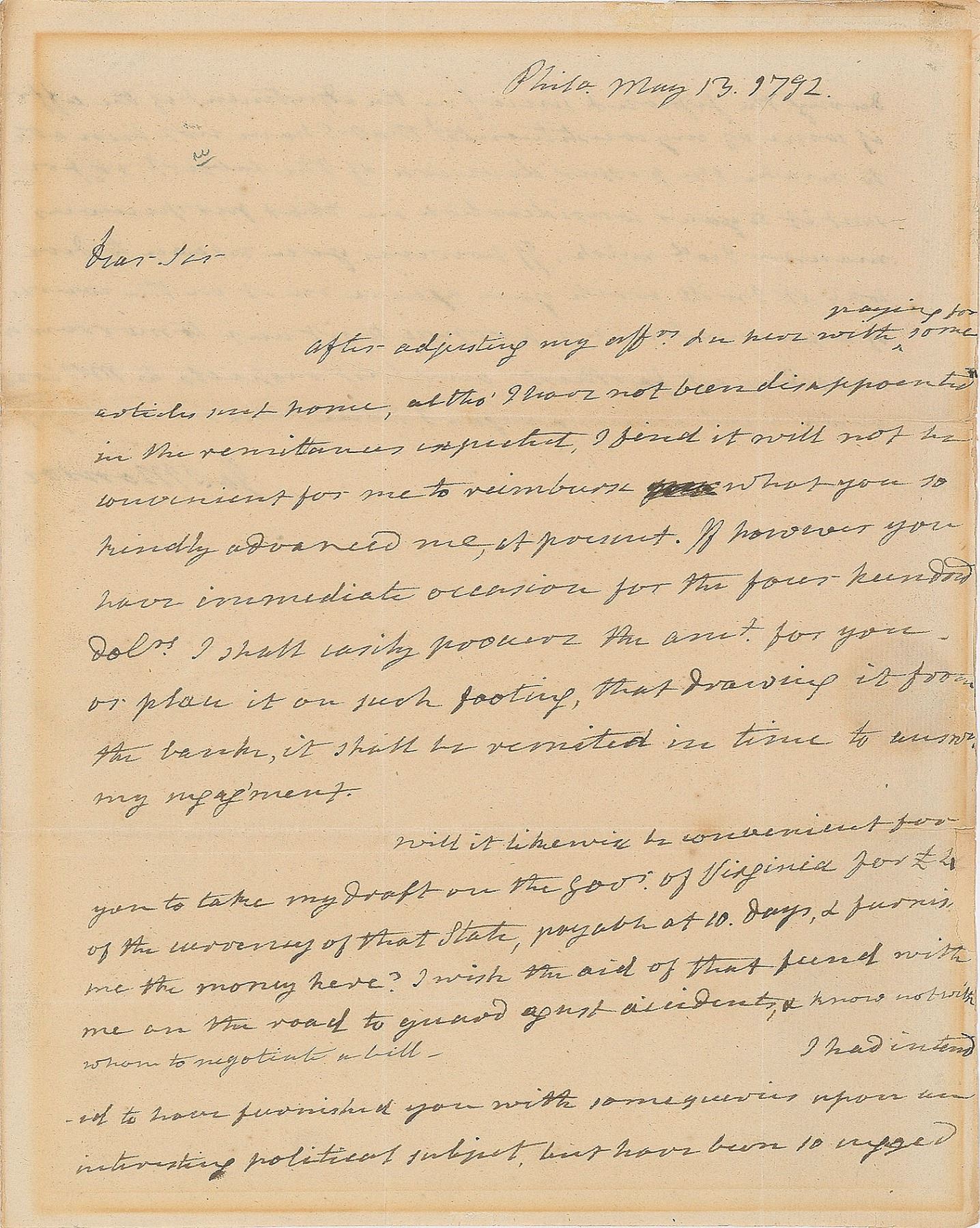 ALS signed “Ja's Monroe,” one page both sides, 7.75 x 9.75, May 13, 1792. Letter to influential political economist Tench Coxe, in full: "After adjusting my affrs. here with paying for some articles sent home, altho' I have not been disappointed in the remittances expected, I find it will not be convenient for me to reimburse what you so kindly advanced me, at present. If however you have immediate occasion for the four hundred dolrs. I shall easily procure the amt. for you—or place it on such footing, that drawing it from the bank, it shall be remit[t]ed in time to answr. by engag'ment. Will it likewise be convenient for you to take my draft on the Govr. of Virginia [Henry Lee] for £40 of the currency of that State, payable at 10 days, & furnish me the money here? I wish the aid of that fund with me on the road to guard agnst. accidents, & know not with whom to negotiate a bill. I had intended to have furnished you with some queries upon an interesting political subject, but have been so engaged during the session & since (in the adjustment of the affrs. of some of my constituents) that I have not been able to make the proper division of the subject, or present it to your consideration in that propitious manner I wd. wish. If however you mean to develop it I will write you advice on it in the course of a few weeks." In fine condition, with a light block of toning to the first page.