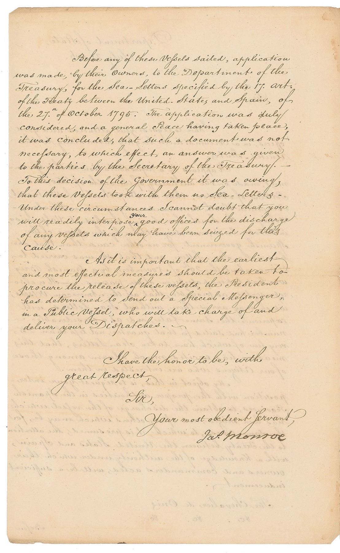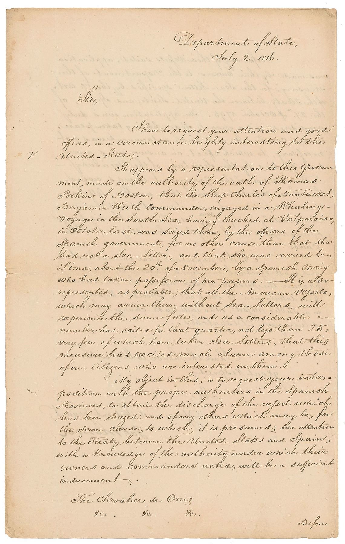 LS as secretary of state, signed “Jas. Monroe,” one page both sides, 8 x 13, July 2, 1816. Letter to the Chevalier de Onis, in full: "I have to request your attention and good offices, in a circumstance highly interesting to the United States. It appears by a representation to this Government, made on the authority of the oath of Thomas Perkins of Boston, that the Ship Charles of Nantucket, Benjamin Wirth Commander, engaged in a Whaling voyage in the South Sea, having touched at Valparaiso, in October last, was seized there, by the officers of the Spanish government, for no other cause than that she had not a Sea Letter, and that she was carried to Lima, about the 20th of a November, by a Spanish Brig who had taken possession of her papers.—It is also represented, as probably, that all the American vessels, which may arrive there, without Sea Letters, will experience the same fate, and as a considerable number had sailed for that quarter, not less than 25, very few of which have taken Sea Letters, that this measure had excited much alarm among those of our Citizens who are interested in them.