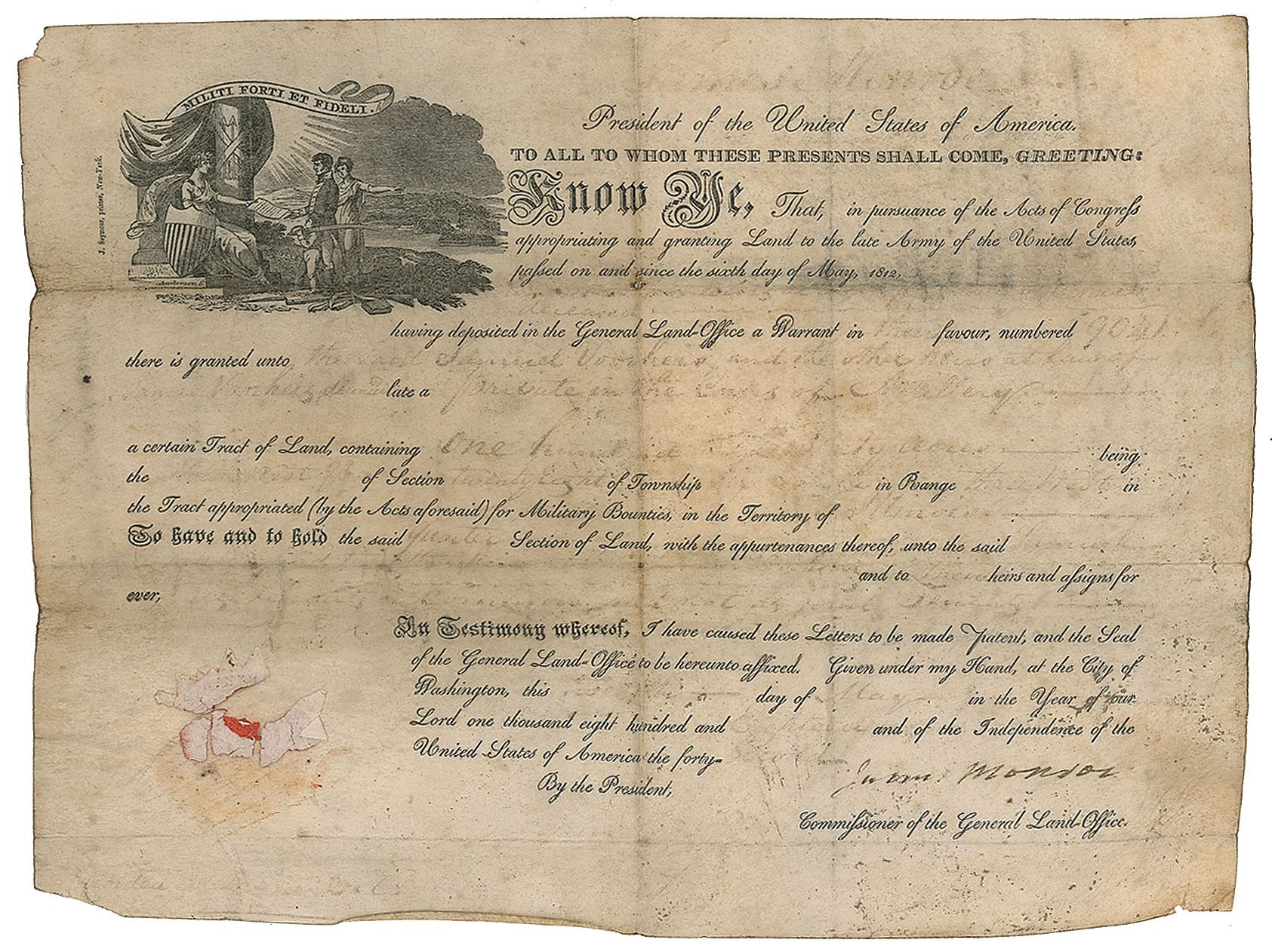 Partly-printed vellum DS as president, one page, 12 x 9, May 1818. President Monroe grants a parcel of land in the Territory of Illinois to a military veteran. In good to very good condition, with heavy soiling, a few tiny holes, missing seal, and the handwritten body faded and difficult to read; Monroe's signature is comparatively clean and unaffected by the document's flaws.
