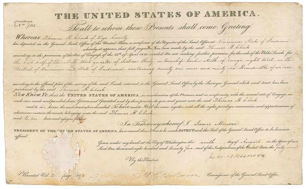 Partly-printed vellum DS as president, one page, 15.5 x 9.5, August 9, 1824. President Monroe grants 71 acres of land to Thomas H. Clark. Signed at the conclusion by Monroe, and countersigned by Commissioner of the General Land Office George Graham. In very good condition, with three vertical folds, one through a single letter of signature, scattered toning and wrinkling, a bit of light spotting and surface wear along one fold. The paper seal is intact, but worn. Thomas H. Clark, the recipient of this land grant, served as Sheriff of Vigo County, Indiana, from 1823-1824.