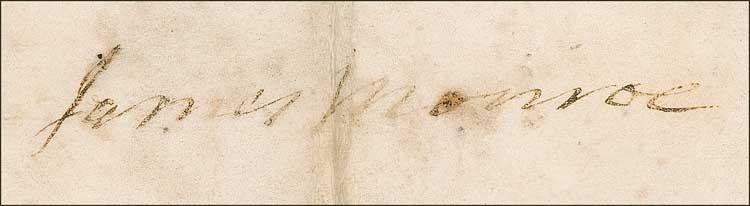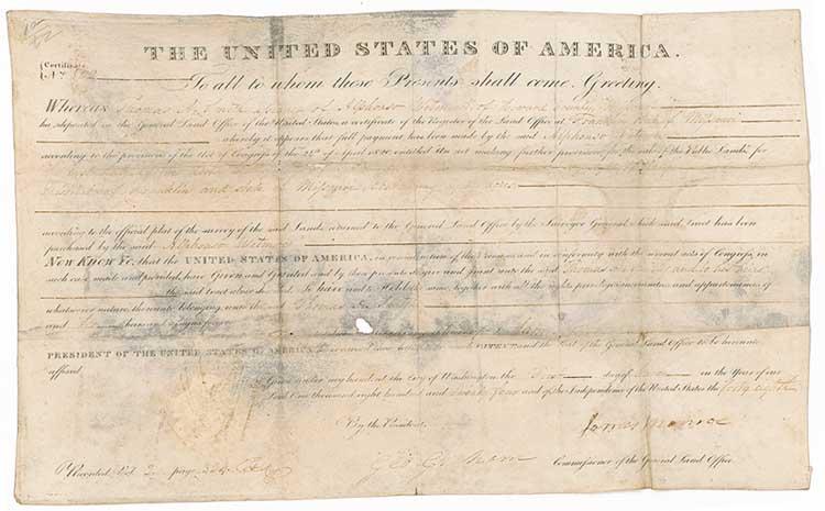 Partly printed DS, one page on vellum, 15.75 x 9.5, June 1, 1824. A grant for 80 acres of land in Howard Country, Missouri issued to Thomas A. Smith, assignee of Alphonso Wetmore. In fair condition, with soiling, staining, and wrinkling, intersecting folds (vertical fold to last name), a few holes to body, and signature on the light side (though fully legible) due to somewhat irregular adhesion and water staining. Pre-certified John Reznikoff/PSA/DNA and RRAuction COA.