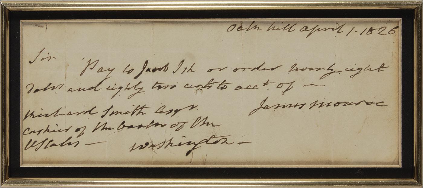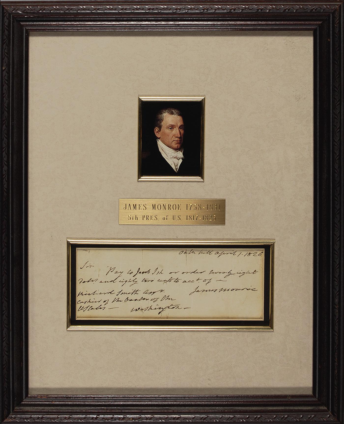 ADS, one page, 7 x 3, April 1, 1826. Monroe orders the Cashier of the United States to “pay to James Ish or order twenty eight dolrs and eighty two cents.” Double matted and framed to an overall size of 13 x 16. In very good condition, with vertical folds, two through single letters of signature, scattered light toning and soiling, and cancellation cuts to lower left. Pre-certified John Reznikoff/PSA/DNA and RRAuction COA.