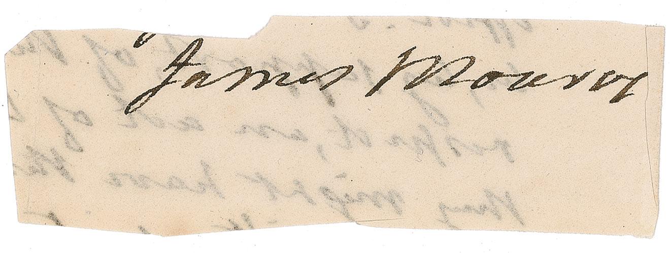 Ink signature, “James Monroe,” on an off-white 3 x 1 slip, clipped from a letter. Irregular edges and light show-through from several words in Monroe’s hand on reverse, otherwise fine condition. Pre-certified John Reznikoff/PSA/DNA and RRAuction COA.