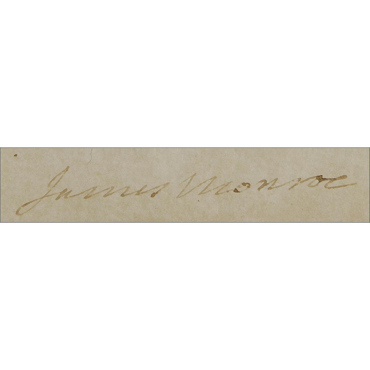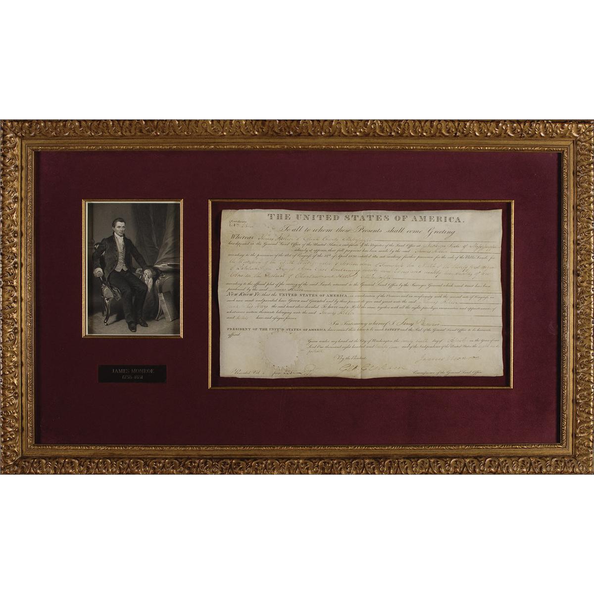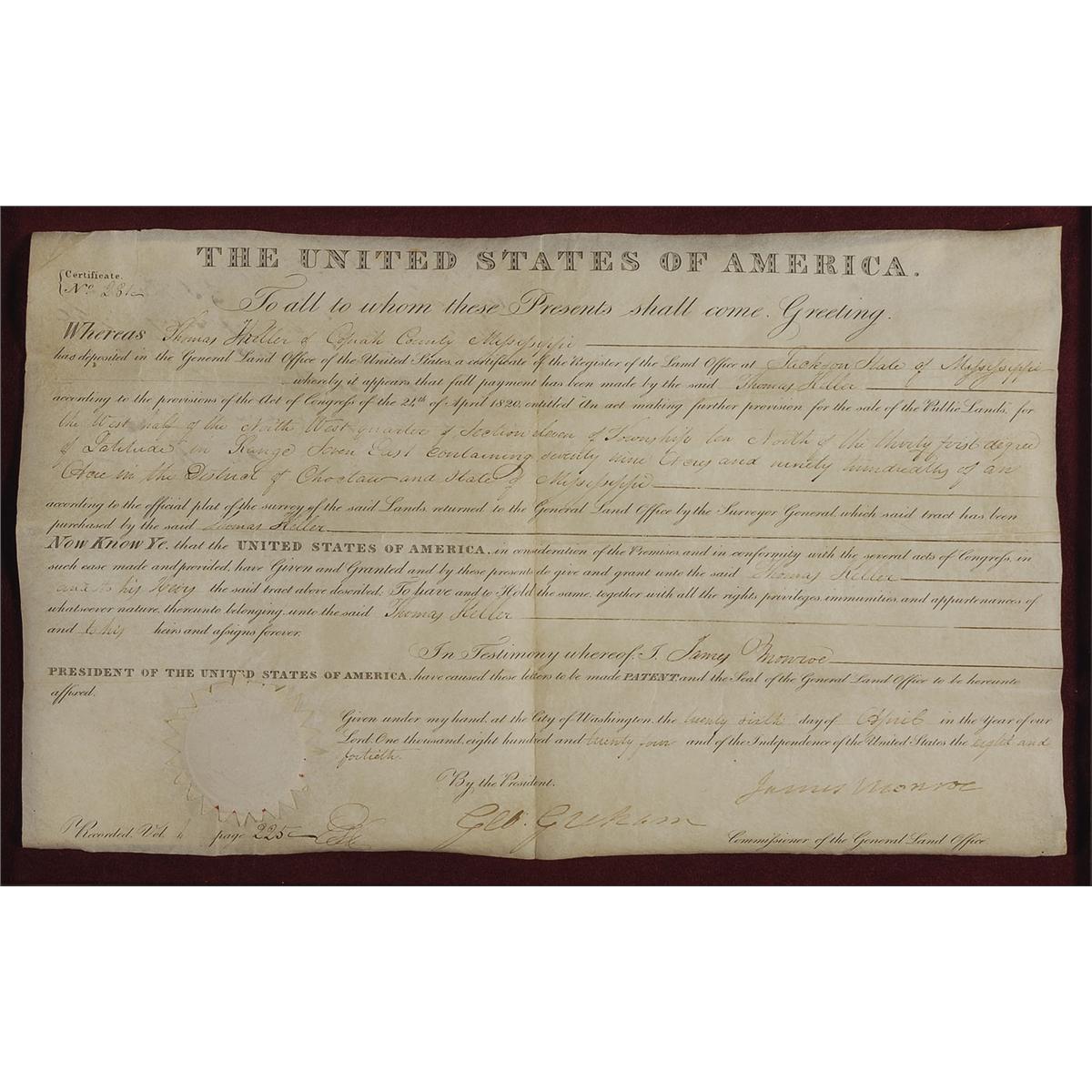 Partly-printed DS as president, one page, 15 x 9.5, April 26, 1824. Monroe grants Thomas Keller almost 80 acres of land in Mississippi. Signed at the conclusion “James Monroe,” and countersigned by Commissioner of the General Land Office George Graham. Nicely cloth matted and framed with a seated portrait of Monroe and a small name plaque, to an overall size of 32 x 19.5. In very good condition, with intersecting folds, uniform light toning, some scattered light soiling, and Monroe’s signature just a shade light. The white seal is worn, but intact. Oversized.